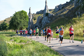 Der Start erfolgte um 09:00 Uhr für alle Wetbewerbe. Da wäre mir persönlich lieber, wenn es einen gestaffelten Start geben würde. Ich nahm mir heute eine Zeit von knapp unter 33 Minuten vor. Am Anfang das erwartete Gedränge und die Stöcke konnte ich gar nicht einsetzen. Auf dem Weg ins Eselsburger Tal hinein, verteilte sich das Feld endlich und nun war auch ein Stockeinsatz möglich. Die Strecke ist ja schön flach und zunächst lief man auf Asphalt. Dieser Abschnitt ist richtig schön und man kommt auch an den Steinernen Jungfrauen vorbei. Den Foto hatte ich zwar bei mir, durch die Stöcke war allerdings an ein Fotografieren nicht zu denken. Nach dem ersten Kilometer eine Zeit von 6.25 min. Dies war zwar langsam, allerdings gab es ja keine Nettozeitnahme und so hätte ich noch einiges an Zeit abziehen können. Auf dem zweiten Kilometer merkte ich doch, dass durch den gestrigen Lauf etwas die Spritzigkeit fehlt, zudem war es halt doch recht warm. Nach 2 km eine Zeit von 12.58 min und damit 6.33 min auf dem letzten Kilometer. Kurz danach der Abzweig, wo es geradeaus für die 10er und Halbmarathonläufer weitergeht und die Kurzstreckler nach rechts über eine Brücke müssen. Die Stöcke hoch und nach der Brücke noch schnell einen Becher Wasser an der Getränkestation. Ich nahm mir nun vor, den dritten Kilometer etwas schneller als den letzten zu walken und wollte bei 19.30 min an km 3 sein. Nun kam ein gekiester Weg und auch etwas Schatten am Waldrand. Zudem ging hier der Stockeinsatz besser. Trotz der Getränkeaufnahme tatsächlich eine Zeit von 19.30 min. Nun beschleunigte ich und konnte einige Läufer überholen. Nach km 4 eine Zeit von 25.50 min und damit 6.20 min für den letzten Kilometer. Damit hatte ich etwas mehr als 7 Minuten für die letzten 1,1 km und das Ziel von unter 33 Minuten war greifbar nahe, zumal es flott weiterging. Vor dem Stadion dann ein Schild mit dem Hinweis, dass es links zum Ziel der 5,2 km-Strecke geht. Also doch noch etwas weiter. Es ging über eine Wiese und dann im Stadion noch eine dreiviertel Runde. Es war nun klar, dass es trotz Endspurt nicht mehr reicht. Mit der Zeit von 33.26,90 min für die dann letztendlich 5,2 km war ich aber absolut zufrieden. Ich hatte auch mein Ziel erreicht, vor dem Sieger über 10 km im Ziel zu sein. Dieser kam nach 35.13 min. So konnte ich die ersten Läufer und Läuferinnen über die 10 km fotografieren und traf im Ziel auch den einen oder anderen Bekannten.