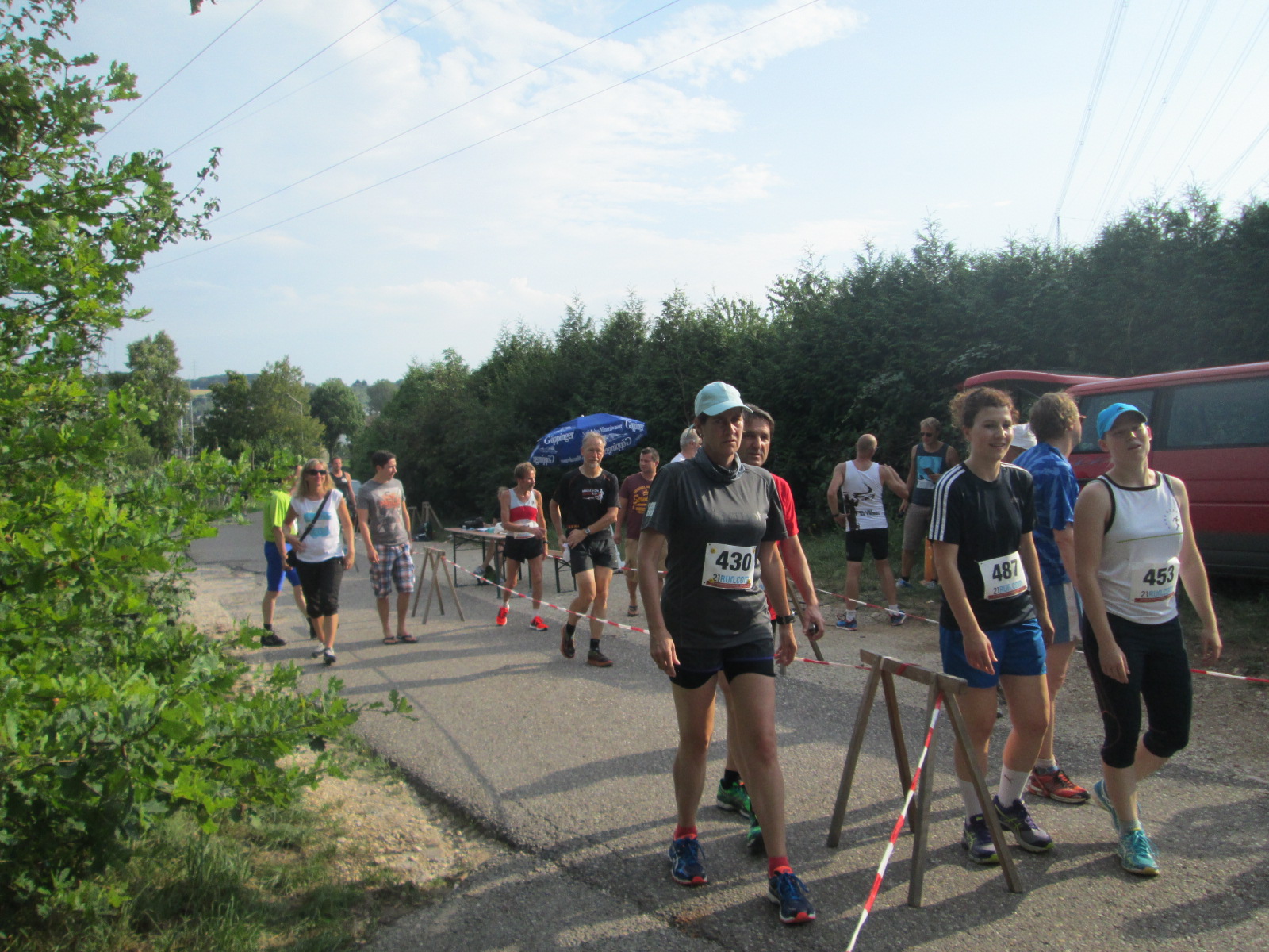 Nun hieß es für Jusra die Startnummer wechseln und auch ich musste mich vorbereiten. Ganz locker lief ich mich warm. Ich hatte schon den Titelverteidiger Moritz Pöndl und einen weiteren starken Läufer ausgemacht. Da war gleich klar, dass es maximal um Platz 3 gehen wird. Das Feld war mit 20 Teilnehmern unwesentlich kleiner als im Vorjahr, als es 22 waren. Die beiden Favoriten setzten sich schnell ab und ich konnte knapp hinter dem Sieger des vorherigen Schülerlaufes bleiben. Den ersten Kilometer ging ich doch sehr verhalten an und die Uhr zeigte 5.12 min. Damit 30 Sekunden über der Zeit von 2013, als ich meine persönliche Bestzeit lief. Nun erhöhte ich aber das Tempo und auch den Druck auf meinen Mitstreiter, den ich inzwischen überholt hatte. Nach dem km 1 kommt ja ein kurzes Flachstück und es geht auch leicht bergab. Es war bei den Temperaturen schon hart, aber ich hielt das höhere Tempo. Nun kamen die Führenden entgegen, es war also nicht mehr weit zur Wendestelle. Nach 2 km dann eine Zeit von 9.30 min und damit 4.18 min auf dem zweiten Kilometer und damit noch unter der Vorjahreszeit und auf diesem Abschnitt auch gleich 33 Sekunden schneller als im Vorjahr und auch deutlich schneller als 2013. Nun fast nur noch bergab. Ich hatte auf die nachfolgenden beiden Jugendläufer einen guten Vorsprung und vor allem auf den Vierten der Männerklasse. Nun kam Jusra zusammen mit Bernd Vöhringer entgegen, der beim Warmlaufen war. Wir klatschten wie letztes Jahr ab. Nun die kleine Senke und nach 12.54 min den dritten Kilometer. Da kam sogar noch jemand entgegen. Die 3.24 min waren stark, aber nun lief es nicht mehr ganz so rund. Ein kleiner Anstieg und danach runter dem Ziel entgegen, das ich nach 16.53 m in erreichte. Damit den letzten Kilometer nur knapp unter 4 Minuten, sonst immer deutlich. Zwar die bislang schwächste Zeit nach 16.34 min und 16.48 min, aber ab km 1 sogar 10 Sekunden schneller als 2013 und angesichts der Verhältnisse war ich absolut zufrieden. Nach zwei Mal Platz 4 nun auch Gesamtdritter, aber nach Platz 1 und 2 nun Dritter der Männer-Klasse. Manchmal halt schon komisch, in der Gesamtwertung immer besser, aber in der AK immer ein Platz verloren. Immerhin einen Podiumsplatz gesichert und die beiden Vorderen waren viel zu schnell. Erst beim Zieleinlauf holte ich diesmal den Foto raus.