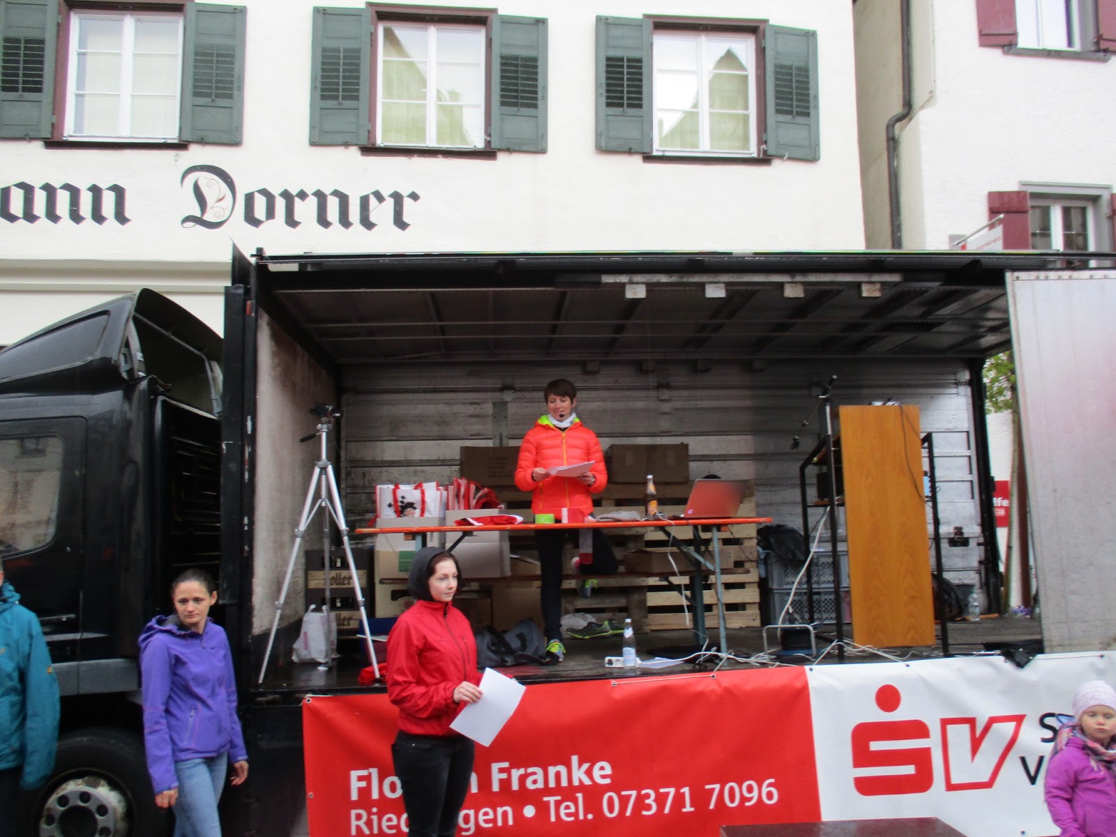 In diesem Jahr fuhren Jusra und ich zum 5. mal in Folge seit 2012 nach Riedlingen zum Stadtlauf. Nicht nur die kurze Anfahrt von 48 km und knapp 40 Minuten sind dafür ein Argument, sondern die Runde durch die Riedlinger Altstadt hat es uns durchaus angetan und zudem treffen wir dort auch eine Vielzahl von Bekannten. In diesem Jahr sollte dies nicht anders sein. Die Wettervorhersagen waren mit 7° - 9° C und dazu noch stärkerer Regen alles andere als rosig. Bei unserer Ankunft waren wir um so positiver überrascht, dass es zunächst noch angenehme 15° C hatte und sich lediglich ein paar Tropfen zeigten. So konnte man es zunächst ganz gut aushalten und wir hatten zu Jusras erstem Start noch eine Stunde. Sie war wie im letzten Jahr für den Schüler- und den Jugendlauf gemeldet. Ich meldete diesmal "nur" für den Jedermannlauf über 2500 m und nicht auch noch im Hauptlauf. Ich hab ja morgen noch zwei harte Wettkämpfe. Immerhin war es bei mir Wettkampf Nr. 28 in diesem Jahr und für Jusra übrigens Nr. 25 und 26. Im Rathaus holten wir unsere Startnummern. Die Schüler- und Jugendläufe kosten 3 €, der Jedermannlauf 4 € und der Hauptlauf über 8 Runden und 10 km 8 €. Da kann man sicher nichts sagen und wir bezahlten für unsere drei Starts 10 €. Es tauchte dann noch Benedikt Hoffmann auf und somit war auch gleich ein großer Favorit für den Hauptlauf ausgemacht. Zunächst hieß es nun noch für Jusra und mich etwas Aufwärmen.