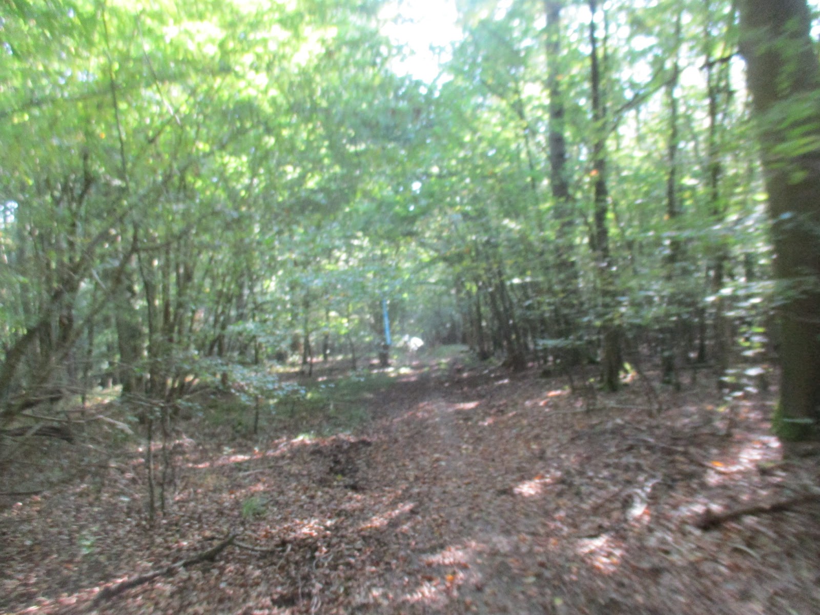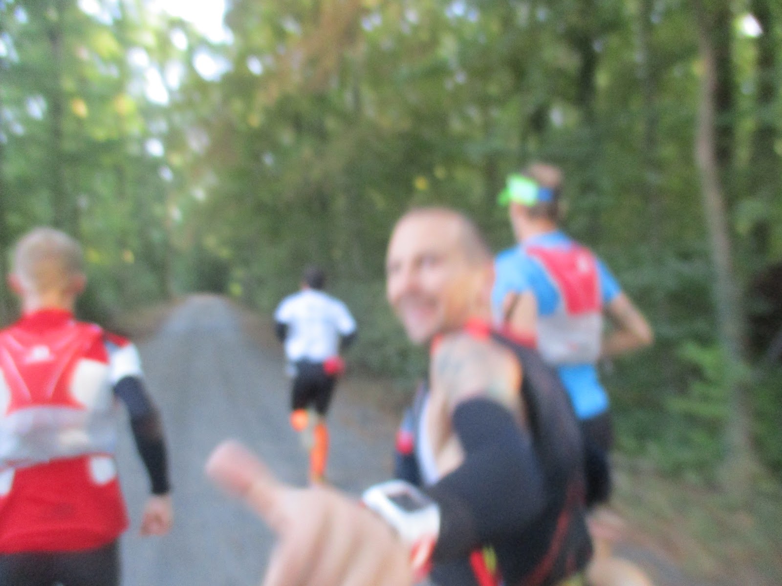 Nun ging es mit Ronny weiter und auch ich machte mal "Führungsarbeit". Daraus resultierten doch prompt auch Bilder von mir. Ich hatte heute vom Start weg den Foto in der Hand und so sollte es auch bleiben. So verlor ich keine Zeit. Ich hatte nun einen guten Rhythmus gefunden und es machte Spaß, zu zweit zu laufen. Die Strecke war auch gut markiert, immer wieder Schilder, Bändel oder auch Streckenposten. Bis auf ein paar Übergänge lief man ausschließlich im Wald und auf Pfaden. Es kam der erste größere Anstieg und es ging nun auch mal steil nach unten. Die einzige technisch ein klein wenig anspruchsvollere Stelle. Da es die letzten Tage trocken war, ging es aber gut, so wie insgesamt die Strecke so gut zu laufen war. Unten angekommen nach rechts weg und zur Abwechslung mal auf einem breiten Waldweg. Dafür wieder mal bergauf und 8 km waren absolviert und die Zeit unter 40 Minuten. Das war weiter stark.