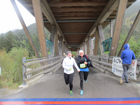 Es lief gleich richtig gut und da ich gerne auch schnell starte, war ich doch ein gutes Stück lang vorne, bis die ersten kamen. Nach ca. 500 m auch Heidrun. Da holte ich den Foto raus. Er blieb dann in der Hand. Bei km 1 zeigte die Uhr 4.15 min obwohl ich vom Gefühl her doch schneller war. Allerdings muss man bei den Angaben ja immer etwas vorsichtig sein. Auf jeden Fall war es die richtige Entscheidung heute mit Mütze zu starten und zudem das lange Hemd unter dem Trikot sowie die Dreiviertelhose, auch in Anbetracht der noch etwas vorhandenen Erkältung. Auf jeden Fall hat es mich nicht gefroren und gegen Ende wurde es nicht zu warm. Dann hat es ja optimal gepasst. Auf die Handschuhe hatte ich verzichtet und obwohl ich immer den Foto hielt war auch dies ok. Man lief zunächst auf Naturwegen, die manchmal doch etwas holprig waren, aber gut zu laufen und leicht wellig. So macht es Spaß, also mir zumindest. Der zweite Kilometer keif nicht ganz so optimal und ich musste ein paar Teilnehmer ziehen lassen. Dann ging es plötzlich wieder. Vor allem nirgends mehr einen Schmerz und auch das Atmen ging gut. Dafür waren die Verhältnisse dann eigentlich sogar eher passend. Es ging nun nach rechts weg über eine kleine Brücke über den Lech, während die Strecke über 10 km noch gerade aus weiter führte. Vor mir war niemand und hinter mir sah ich auch niemanden. Da konnte ich befreit laufen und bei km 3 eine Zeit von 12.35 min. Nun ging es auf der anderen Seite des Lech flussabwärts. Da war der Weg asphaltiert und es lief super. Vor km 4 kam noch ein Anstieg. Ich bewältigte ihn sehr gut und nun ging es ja tendenziell wieder nach unten. In einer Kurve noch einige Zuschauer und Anfeuerung. Leider war der Akku meines Fotos ausgegangen. Da es der alte ist und nur als Ersatz dient hatte ich leider nicht mehr nachgeschaut, wobei es auch an der Kälte lag, da er nun wieder funktionieren würde. Da konnte ich mich noch mehr auf das Laufen konzentrieren und die Brücke kam schon in Sicht, was nochmals motivierte. Vor allem bei einem Blick auf die Uhr. Da war evtl. noch eine Zeit unter 20 Minuten drin. Der Weg über die Brücke zog isch aber noch noch. Ich war aber mit einer Zeit von 20.05,7 min bei den 50 Höhenmetern mehr als zufrieden und wurde unter den 42 Teilnehmern Gesamtdritter. Die Wertung erfolgte am Ende aber nach Durchschnittszeit, aber egal, ich weiß nun wo ich stehe und sehe dem morgigen Start von Lindau nach Bregenz wieder etwas optimistischer entgegen. Als ich mich angemeldet hatte fehlte übrigens noch der Hinweis auf die Wertung nach Mittelzeit.