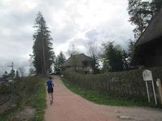 Nun ging es erst mal durch Schluchsee und auf Asphalt tendenziell auch noch bergab. Ich lag gleich weit vorne, so auf Platz 8. Noch im Ort hole ich den Foto raus. Da hatten mich gerade zwei junge Damen überholt, die nun bei den Frauen in Führung lagen. Den ersten Kilometer absolvierte ich in 3.57 min und dabei ist es mir noch nicht mal so schnell vorgekommen. Nun ging es aus dem Ort raus und auch ein kurzer Übergang auf einem gekiesten Pfad. Es folgte nun aber ein längerer Anstieg auf einem Radweg. Stand da nicht was von einer flachen Strecke? Immerhin sollten es am Ende 112 Höhenmeter sein, aber das ist immer eine Frage der Perspektive und ich mag es hügelig. Man kam nun in den Wald und der Weg war richtig gut zu laufen. Es ging tendenziell noch immer nach oben, auch wenn immer wieder mal runter. Gerade bergauf konnte ich wieder näher ran laufen und Thomas war auch noch gut in Sichtweite. Bei Kilometer 4 war ich an einem Trio mit den beiden Damen dran und lief dann auch vorbei und eine Weile hinter dem Führungsrad, bevor ich es auch bergab überholte. Nach 5 Kilometer dann eine Zeit von 22.24 min. Normal nicht berauschend, aber angesichts der gestrigen Wettkämpfe und dem Streckenprofil absolut in Ordnung. Vor allem lag ich unter den ersten 10 und damit sah es auch in der AK hoffnungsvoll aus und dies trieb mich an.