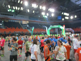 Nun ging es vor den Eingangsbereich und zum Fototermin bei Runners Point. Leider hatte ich den aber ganz knapp verpasst. Ich freute mich, mal wieder Josi Kelz bei einem Wettkampf zu treffen. Ein letztes kurzes Aufwärmen schloss sich an und dann ging es in den Innenraum der Ratiopharm Arena, wo der Start erfolgte und sich auch das Ziel befand. Es herrschte dort schon ein ganz schönes Gedränge, wobei ich davon verschont blieb, weil ich gleich unten rein konnte. Die meisten der am Ende 2000 Teilnehmer sammelten isch auf den Treppen. In der Halle war es natürlich schon angenehm, ich befürchtete aber, dass es beim Rauslaufen so ist, wie wenn man gegen eine Wand läuft,so schwül wie es war. Noch war Zeit für die eine oder andere Unterhaltung, viele Fotos und ein paar Dehnübungen. Ich war überrascht, dass ich mit der Uhr sogar in der Halle ein Signal bekam. Schon mal nicht schlecht. Titelverteidiger Darko Tesic war wieder am Start und sicher in der Favoritenrolle wie bei den Frauen Angela Beckmann. Es war schön auf so viele Bekannte zu treffen. An sich mag ich ja so große Veranstaltungen nicht. Hier fühlte ich mich aber wohl. Es gab noch ein Aufwärmprogramm.