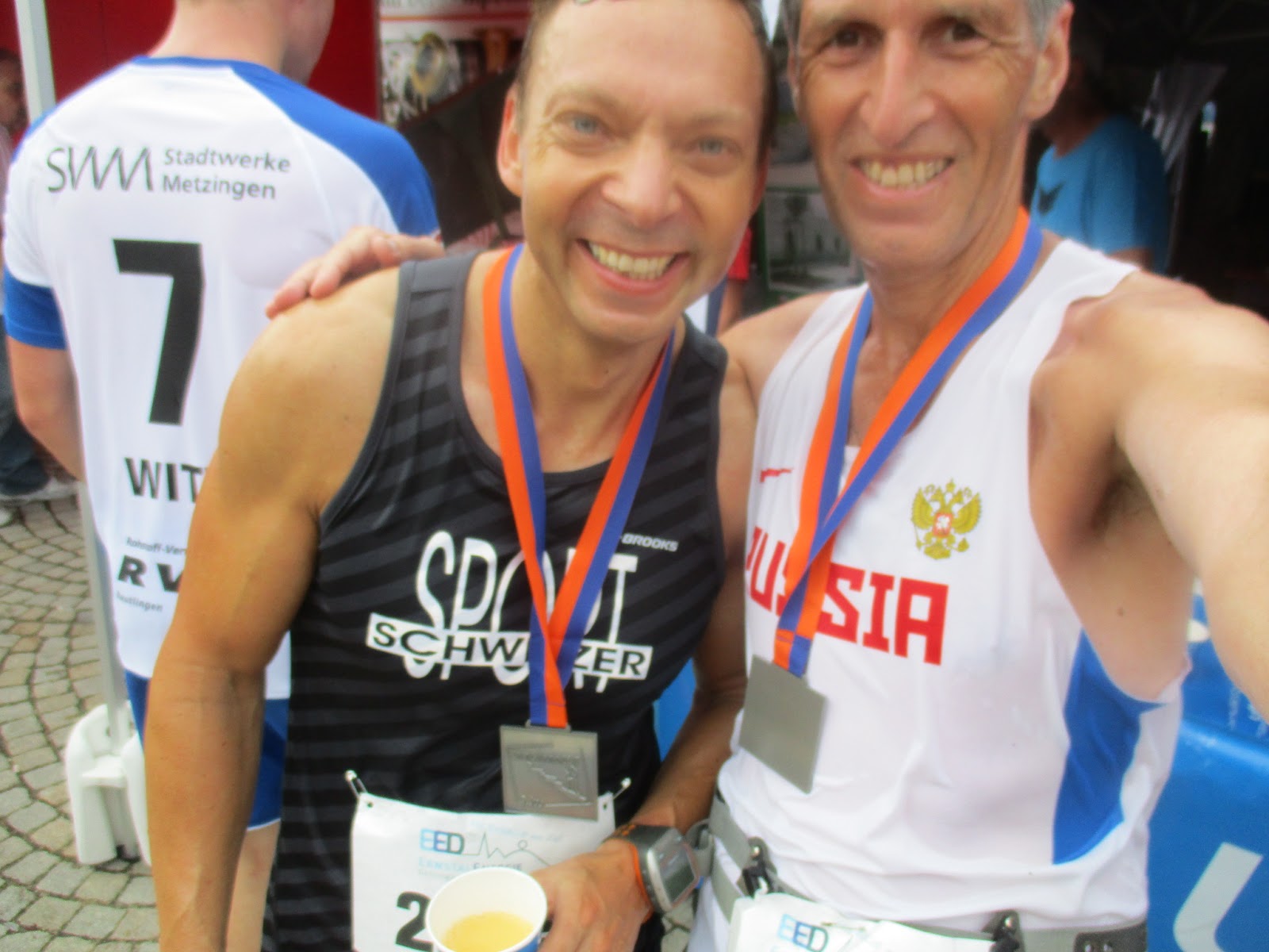 Es ging nun an einem Zelt mit Dusche vorbei oder wer mochte durch und der nächste Getränkestand folgte, bevor es rechts weg und an der Bahnlinie Richtung Metzingen entlang ging. Nun packte mich doch etwas der Ehrgeiz und ich wollte es wissen und überholte immer mehr. Der neunte Kilometer war mit 4.12 min prompt der schnellste und insgesamt 39.29 min. Nun war auch Metzingen erreicht und die Nähe des Ziels setzte durchaus noch mal Kräfte frei. Da ich nun doch schneller lief, war ich nach den vergangenen Wettkämpfen doch erstaunt, wie es ging. Den zehnten Kilometer lief ich noch in 4.15 min, Das war ein starkes Finale und ich hatte noch viele Plätze gut gemacht. Mit 43.44 min auch prompt eine Sekunde schneller als letztes Jahr, allerdings war das Ziel 80 m entfernt. Deshalb am Ende eine Zeit von 44.00 min. Ein klein wenig hatte mich das schon geärgert, da ich erst nach dem Ziel stoppte und das nach 43.59 min. Nun fehlte eine winzige Sekunde zum eigentlichen Maximalziel. Allerdings konnte ich nach dem Wochenende mehr als zufrieden sein und schließlich hatte ja vor allem der Fuß gehalten. Ich wurde in der Gesamtwertung immerhin 102. von 1120 und bei den Männern 93. von 696. Etwas verschlechtert, aber bei halt auch viel mehr Teilnehmern. Dafür in der AK M50 ein so nie erwarteter 7. Platz unter gleich 81 Startern. Gewonnen hat natürlich Daniel Noll und das in einer super Zeit. Bei den Frauen prompt Stefanie Kuhnert, übrigens vor Titelverteidigerin Katrin Kommer, deren zweiter Platz mich freute. Wie sagte der Sprecher beim Start als ich ihr noch kurz was sagte: Sie hat heute einen freundlichen Russen (lag am Trikot) im Nacken. Dazu war sie aber viel zu schnell. Hatte sie erst wieder im Ziel gesehen.