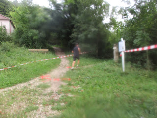Der Start zum Berglauf, der in diesem Jahr zugleich die Mittelfränkische Meisterschaft war und entsprechend gut besetzt, erfolgte um 17:30 Uhr. Es war für mich in diesem Jahr bereits der 89. Wettkampf. Bei den Schuhen setzte ich wieder auf meine leichten Inov-8-Trailschuhe, allerdings die neuen. Natürlich hatte ich wieder den Foto dabei. Die Distanz beträgt 6,5 km mit 280 Hm. Es ging dann auch pünktlich los und die ersten drei Kilometer erst mal auf Asphalt. Auf dem ersten Kilometer ging es auf dem schmalen Weg immer leicht ansteigend und da war die Zeit von 4.07 min (ich gehe bei den Zeiten von den Markierungen aus, meine Uhr "hinkte" immer etwas nach) absolut in Ordnung und minimal, nämlich 2 Sekunden, schneller als letztes Jahr. Nun ging es links weg und da erst mal leicht abschüssig. Nur etwas Wind störte das schnelle Vorankommen. Ich wurde nun von Ralf Throm überholt, der etwas verhalten begonnen hatte und ich konnte doch recht weit vorne gut mithalten. Den zweiten Kilometer hatte ich in 4.05 min absolviert und war mit 8.12 min 1 Sekunden schneller. Also genau so gestartet wie letzes Mal und erst jetzt ging es ja richtig los.