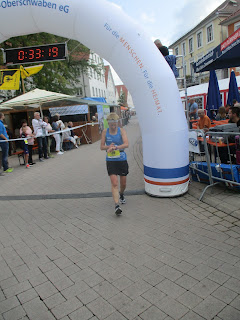 Es ging in die vierte Runde und kurz nach Beginn überrundete mich als erster Edwin Singer, der seiner Favoritenrolle gerecht wurde und einem souveränen Gesamtsieg entgegen lief. Wie viele noch kommen werden? Nun war ich an Angelika dran und dadurch wurde es dann etwas scheller. Als es rechts weg Richtung Minigolfplatz ging aber noch eine kurze Verzögerung, weil da kam der Gesamtzweite Sascha Leitke vorbei und auch ihn wollte ich wie zuvor Edwin fotografieren und es klappte. Nun aber weiter und auf dem Weg zurück in die Stadt war ich an den beiden dran und in der Kurve Richtung Ziel überrundete noch als letzter der Gesamtdritte Robin Adelwarth und ich lief dann an Angelika vorbei und absolvierte Runde 4 in 5.42,4 min und damit alle Runden innerhalb nicht mal 4 Sekunden und die letzten drei sogar innerhalb von 1,4 Sekunden. Viel präziser geht es glaub kaum.
