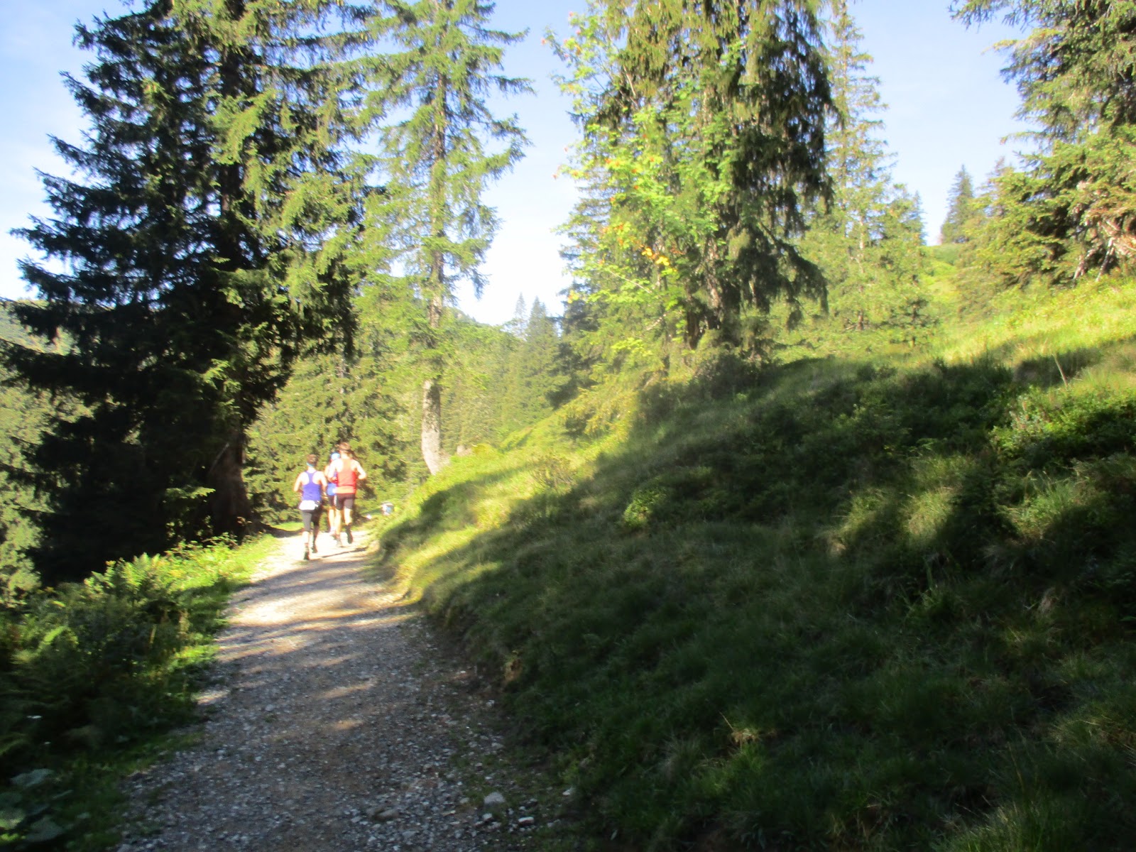 Nun folgte der Anstieg zum Sigiswanger Horn. Da ging es nach einem kurzen Asphaltstück und einem Kiesweg steil hoch über Wurzeln und Felsen. Ein herrlicher Abschnitt und schon Trailcharakter.. Im Wald aber auch schattig. Der zehnte Kilometer ging auch meist noch gut hoch. Da hatte ich eine kleine Schwächephase und entsprechend auch nur 10.13 min und der einzige Kilometer über 10 Minuten, wobei es auch etwas schwieriger zu laufen war, die Schuhe sich aber durchaus bewährten.Somit die ersten 10 Kilometer in ca. 1:10 min absolviert und da war mir fast klar, dass es nichts mit 2:05 h wird.