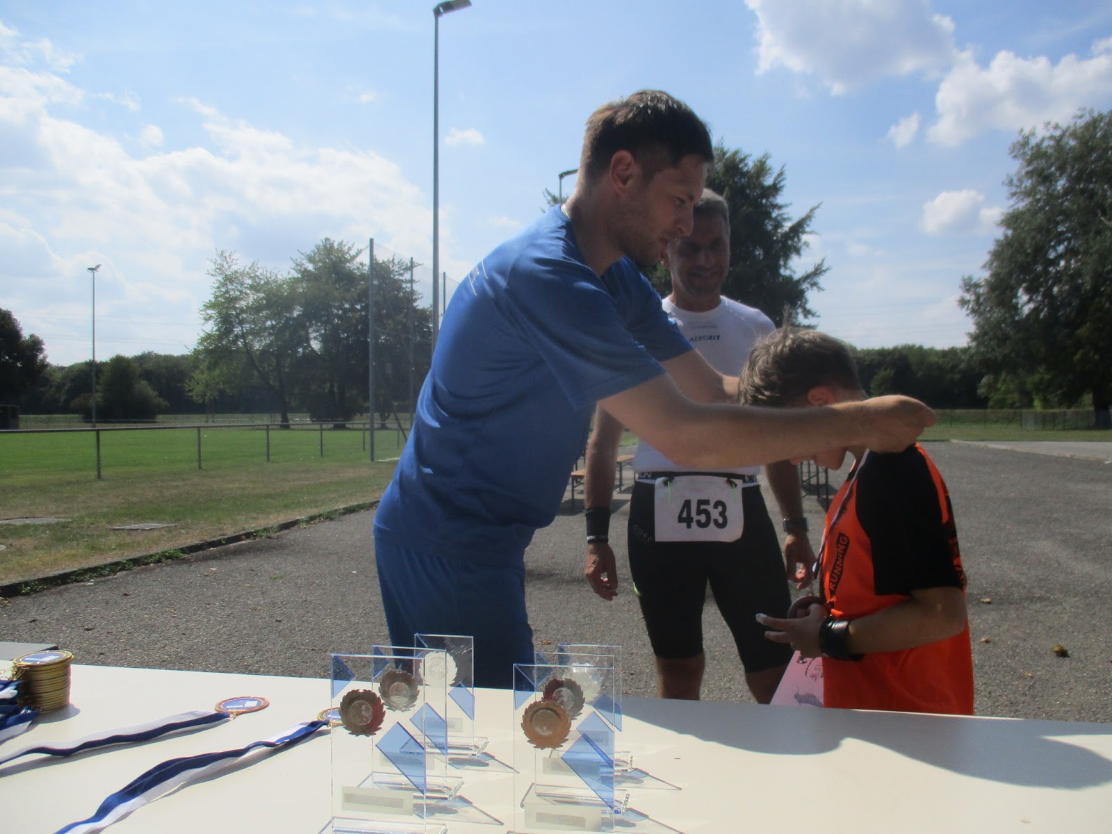 Der Start zum Landkreislauf mit den Läufen über 10 km und 2,5 km über vier bzw eine Runde erfolgte um 12:00 Uhr. Ich war gespannt, wie ich diesen Lauf absolviere. Ganz neu war die Kombination allerdings nicht, denn 2014 lief ich so schon in Würzburg. Damals aber Jusra über 10 km begleitet. Es war nun mit 26° C ganz schön heiß und auf der ca. 2,5 km langen Runde kaum mal Schatten. Da revidierte ich die Zielzeit auf 48 Minuten. Es ging los und lief noch erstaunlich gut. Erst wieder wie vorhin Richtung Wald, aber dann nicht links zur Iller, sondern rechts unter der Brücke durch (Asphalt und Schatten waren da heute eine Wohltat). Danach links auf den Damm und ein Grasweg. Es kam eine Wende und leicht abfallend zur lller. Ich lag in dem allerdings überschaubaren Feld gar nicht schlecht und hätte vor allem nie gedacht, dass ich dann nicht mehr überholt werden sollte. Es ging an der Iller entlang und das zig sich schier unendlich. Unter der Brücke grobe Steine, was echt hart war und dann wieder langgezogen. Nach einem flotten Auftakt mit 4.15 min (etwas verrückt, das konnte nicht gut gehen) nun für den zweiten Kilometer 4.35 min. Es ging nach links auf den Pfad und ein kurzer, aber heftiger Anstieg und die erste Runde war geschafft und mit 10.45 min ganz schön schnell. Da wäre ich diesmal sogar Sieger über 2,5 km geworden und das wäre entspannter gewesen als das Kommende. Schön dass Matthias noch hier war und tolle Bilder machte.. Nun war es wichtig zu trinken. Auf der zweiten Runde sah ich an der Wende, dass die Gruppe hinter mir fehlte, denn die liefen die Kurzstrecke. Mit 4.45 min, 4.54 min und 4.52 min wurde es bis Kilometer 5 doch deutlich langsamer, aber andere hatten sicher auch mit der Hitze zu kämpfen. Muskulär fühlte es sch weiter gut an. Dann aber nach der zweiten Runde und einer Zeit von ca. 22.30 min standen zwei am Getränkestand und ich konnte kein Wasser greifen. Das war fatal und sollten lange 5 Kilometer werden. Dennoch konnte ich zunächst noch das Tempo gut halten. Endlich dann links weg und die dritte Runde geschafft. Allerdings war der achte Kilometer in 5.14 min nicht nur langsam, sondern auch heftig und ich rechnete schon damit, dass ich von hinten kassiert werde. Dann aber der Schatten unter der Brücke und mit viel Willen auf den Damm und nach der Wende niemand gesehen. Das musste doch reichen. Am letzten Anstieg doch kein Gehen, wie ich es schon erwartet hatte, denn die Zeit war überraschend gut und ich kam nach 46.55 min ins Ziel, wobei die Strecke etwas kürzer war. Ich war erst mal fix und fertig. Immerhin Rang 11 Gesamt und 9. Mann und in der AK M50 Rang 2. Vor allem war das Experiment absolut gelungen und ich brachte mal wieder seit langem eine 100 km-Woche hinter mich.