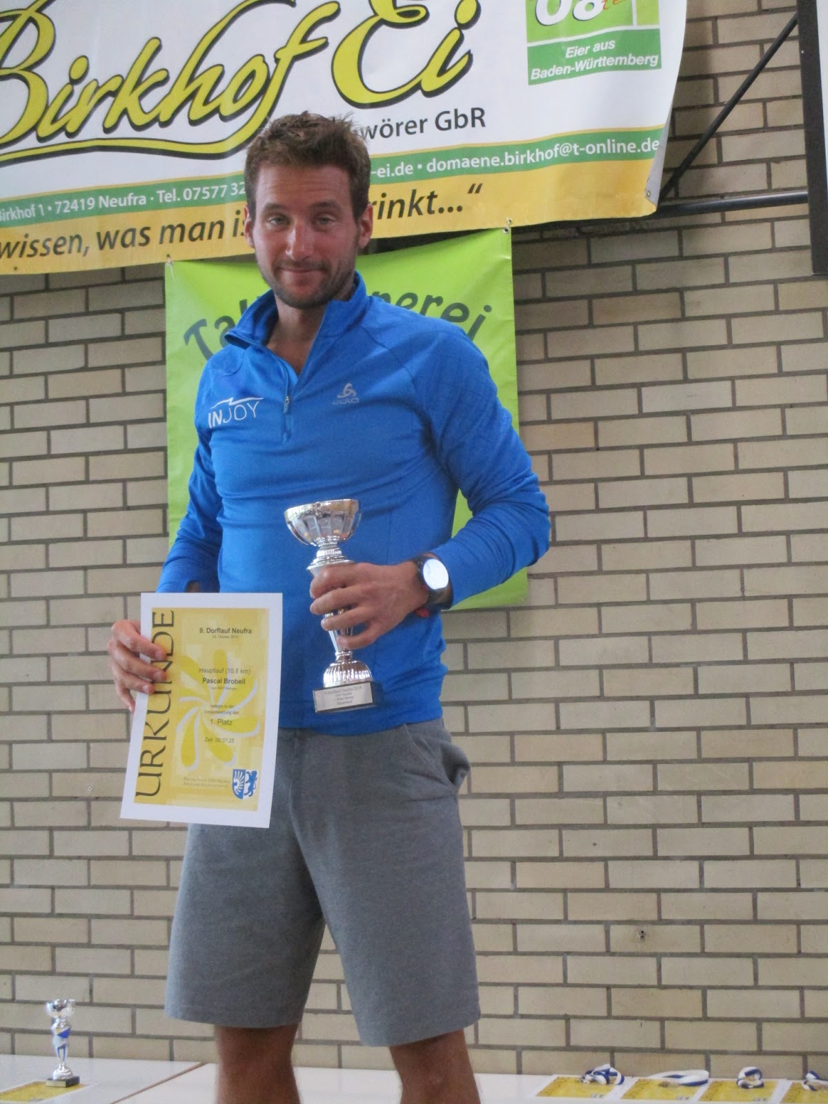 Der Start zum Hauptlauf und Nordic Walking über 10,8 km und über die Kurzstrecke von 5,8 km (da wurden die bisherigen 6 km richtig nach unten korrigiert) erfolgte gemeinsam um 14:00 Uhr. Es war in diesem Jahr bereits mein 108. Wettkampf. In den Jahren zuvor waren es hier die Nummern 73, 99 und 105 und da es immer der selbe Tag ist deshalb gut vergleichbar. Ich versuchte möglchst schnell zu starten und nach einem leichten Anstieg geht es linsk erst mal etwas runter und dann immer so leicht abfallend durchs Dorf und an der Kirche vorbei. Dort ein paar Ecken, aber das Feld zog sich schnell auseinansder. Bei den Schuhen diesmal die Inov-8 Trail Talon 250, mit denen ich letzten Sonntag in Buchenberg auf Asphalt gut zurecht kam, auf den Trailabschnitten ja sowieso. Es kam ein schmaler Fußweg und da hätte ich etwas schneller können, was der Vordermann aber nicht zuließ. Noch eine Straße überqueren und der erste Kilometer war in 4.01 min absolviert. Etwas langsamer als sonst, aber natürlich immer noch in einer guten Zeit. Leider schmerzte nun der linke Fuß etwas, was ich aber verdrängte, hoffte ich doch darauf, dass nach ca. 1,5 km der Untergrund von Asphalt auf Kies wechselte und da ging es prompt besser und ich konnte nach vorne sogar aufholen. Die Zeit v0n 4.10 min für den zweiten Kilometer ließ sich sehen. Nun noch einige Hundert Meter, eine kleine Welle und dann ging es rechts weg. Uwe Beil hatte nachgemeldet und schon enteilt, war sicher auch der Favorit. Dann sah ich auf der Wiese noch zwei Läufer und auf Rang 3 Conrad Heinemann, gegen den ich sicher keine Chance hatte, der aber immerhin gar nicht so weit weg war. Vor mir bog noch Ruben Armbruster, ebenfalls ein junger Läufer, ab. Auf der folgenden Wiese versuchte ich ran zu kommen und dann die Rampe hoch zum Waldweg. Ganz schön hart, wenn man auf Anschlag läuft. Immerhin hat die Kurzstrecke 86 Hm. Es geht dann rechts am Waldrand weiter und alles war gut markiert. Es stieg nun erst etwas mehr an und dann doch immer leicht. Das war nicht einfach und hinten sah ich noch einen Läufer, aber doch mit gutem Abstand. Mit den 4.29 min und insgesamt 12.40 min war ich heute super zufrieden und der Fuß hielt nun auch und ich kam immer näher an meinen Vordermann heran. Ich kämpfte zumindest um den vierten Gesamtplatz. Der vierte Kilometer hat insgesamt Netto den größten Anstieg und die 4.35 min waren zwar nicht so wie die letzen Jahre, aber dennoch zufrieden stellend und vor allem ging ich nun an Ruben vorbei und konnte mich bei Erreichenvon Neufra schon einen kleinen Vorsprung heraus arbeiten. Nun aber wieder auf Asphalt. Der linke Fuß meldete sich wieder, als es steiler runter ging, aber danach passte es und ich wollte mir den Platz nicht mehr nehmen lassen. Die 4.29 min für den fünften Kilometer waren zwar nicht so gut, aber am Ende holte ich 40 Sekunden Vorsprung heraus. Es ging am Schluss wieder auf dem selben Weg zurück und kurz vor dem Ziel dann der letzte Anstieg, nicht besonders steil, aber zu dem Zeitpunkt tut es dennoch weh. Ein Blick zurück zeigte aber, dass ich weit voraus war und so konnte ich nach der Rechtskurve die letzten Meter Richtung Ziel, wo man wie gewohnt von Ferdi Riester als Sprecher begrüßt. Ich kam nach 24.25 min als Gesamtvierter ins Ziel. Nicht ganz so schnell wie 2015 und 2016 und an die Zeit vom Vorjahr war eh nicht zu denken, aber insgesamt doch zufrieden und mit einer ansteigenden Tendenz. In der AK M50 wäre es der zweite Rang hinter dem Gesamtsieger gewesen, aber dieses Mal wurden die AK-Wertungen in der Ergebnisliste leider nicht ausgewiesen. Die Ergebnsse konnten wieder sofort auf einer Tafel eingesehen werden, ein toller Service. Im Ziel bekam man auch wieder eine Tüte mit einigem Inhalt überreicht.
