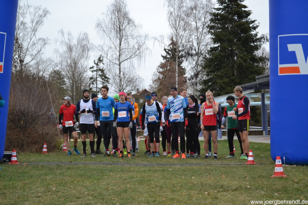 Der erste Start erfolgte um 12:30 Uhr über die Mittelstrecke mit 3 Runden und 3,3 km, sowie zum Lauf der Jugend U18 und U16 über 2 Runden und 2,2 km. Es war in diesem Jahr bereits mein 141. Wettkampf und der Auftakt zum 31. Mehrfachstart in diesem Jahr. Bei der Bekleidung bei den Temperaturen natürlich die dreiviertellange Hose und unter dem Trikot das dünne Langarmshirt. Dann Handschuhe, Halstuch und das Stirnband, das ich doch noch der Mütze vorzog. Bei den Schuhen wie erwähnt die Crosslaufschuhe von Brooks. Ich traf noch Roland Rigotti, der es dieses Jahr auch auf rund 90 Starts bringt und den ich schon mehrmals getroffen hatte. Dann ging es los und es wurde schnell auf das Tempo gedrückt. Als man wieder in die Gegenrichtung lief, war ich in dem Feld recht gut platziert. Es ging das erste mal links den größeren Anstieg hoch. Da war es noch kein Problem und danach konnte man richtig schön Tempo machen. Ich beendete die erste Runde nach starken 4.30 min. Gleich zu Beginn der zweiten Runde überholte ich eine junge Dame, an die ich auf der zweiten Hälfte der ersten Runde immer näher heran kam. Ihr Trainer meinte noch sie soll dran bleiben, aber bei mir lief es nun. Klar wurde ich langsamer, aber halt nicht so wie die anderen und auch der dahinter laufende gute Bekannte Jörg Behrendt verlor nun an Boden. Man konnte die anderen ja an mehreren Stellen gut beobachten. Ich absolvierte diese zweite Runde in 4.45 min. Nun in die letzte Runde und an den kleinen Anstiegen merkte ich es nun doch schon, aber überraschend nicht am langen. Als ich da oben war, wusste ich eh, das würde ich nun nach Hause laufen und ich war auf dem zehnten Gesamtrang, wobei die vorne doch schon weit enteilt waren. Ich verlor in der dritten Runde mir 4.49 min nur wenige Sekunden und kam nach 14.04 min als 7. Gesamt bei den Männern und als Sieger der AK M50 ins Ziel. Mit dieser Zeit war ich mehr als zufrieden, hatte ich ursprünglich vorgehabt, gerade so unter 15 Minuten zu bleiben. Vor allem war ich gleich völlig entspannt, hatte am Ende der letzten Runde auch etwas Tempo raus genommen.