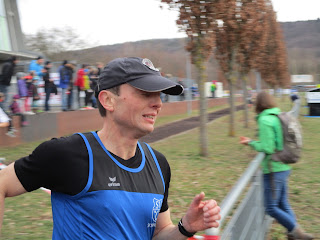Ich machte mich nun wie üblich an das Aufwärmen und Erkunden der Strecke. Diese gibt es so seit 2017 und man läuft hier mit dem ursprünglichen Start an der Straße und um das Stadion herum dann gegen den Uhrzeigersinn, wie es hier üblich ist, bis beim ersten Lauf die Richtung geändert wurde. Die beiden Strecken sind inzwischen total unterschiedlich, was für gute Abwechslung sorgt. Auf der anderen Seite des Stadions dann auf der etwas matschigen Rindenschrotbahn und dann links weg Richtung Park Markwasen, am See vorbei und ein Stück ebenfalls auf der Rindenschrotbahn, weil die Gegenrichtung später der zweiten Runde über 10 km vorbehalten ist, Nach der Holzbrücke hat man auch den ersten Kilometer geschafft. Es geht weiter Richtung Wald und dort kurz auf Asphalt am Rand entlang leicht bergauf, bevor es nach links in den Wald geht und dort nun ca. 1 km immer leicht, mal auch etwas mehr, bergauf. Hier sind die meisten der doch immerhin 72 Hm zu absolvieren. Endlich oben nach links und nach einem ersten Stück bergab wieder nach rechts, wo es erst flach ist und dann noch einmal leicht ansteigt bis es nach links weg ein gutes Stück runter geht. Die Strecke im Wald war schnee- und eisfrei. Nur an einer kleinen Stelle etwas Matsch, also super zu laufen. Wenn man unten angekommen ist, geht es nach rechts wieder in den Park und auf dem schmalen asphaltierten Weg leicht bergauf, bevor man zum Stadion unter läuft. Insgesamt lief ich gut 5 km und fühlte mich richtig gut, bin bei der doch ungewohnten warmen Witterung im Vergleich zu den letzten Wochen ganz schön ins Schwitzen gekommen. Am Ziel traf ich noch Benni Lau, der sicher wieder für gute Fotos sorgen wird. Ich hatte erstmals meinen neuen Foto dabei und so geht wieder der Zoom richtig und auch so ist die Qualität endlich wieder besser.