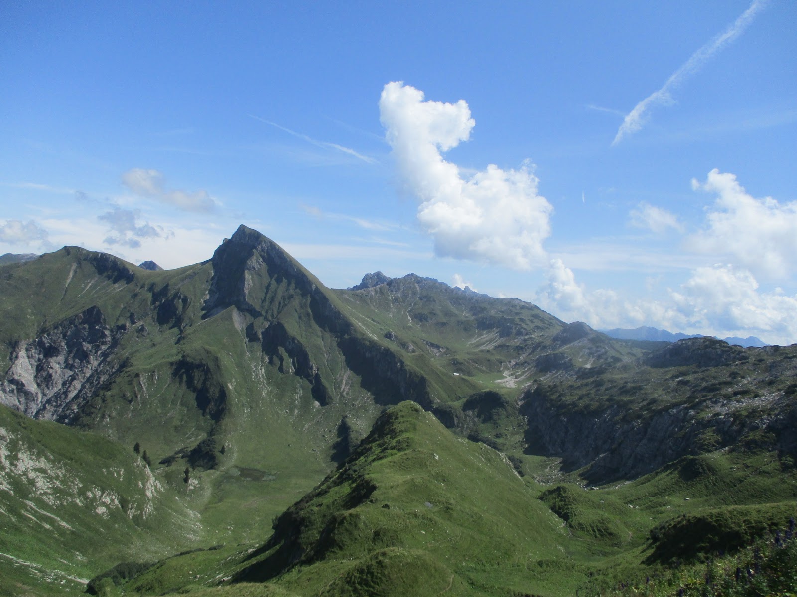 Es eröffnete sich ein gigantischer Blick auf dem Grat. Wir waren nun ja auf dem Jubiläumsweg. Gelesen hatte ich schon viel darüber, aber was mich die nächsten Kilometer erwartete übertraf meine Erwartungen weit. Wie übrigens die ganze Tour. Man sah ins Illertal Richtung Sonthofen und den Grünten. Aber insgesamt in alle Richtungen einfach eine atemberaubende Aussicht. Hier musste man verweilen, wie wir ja immer wieder kurz Pausen machten, um die Augenblicke zu genießen. Ich hatte 1 l Wasser dabei und die Hälfte war fast schon weg. Gestern über die hügeligen 20 km benötigte ich nichts, aber heute war ich froh beide Flaschen eingepackt zu haben.