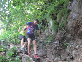 Am Jubiläumsweg ging es weiter zum Schrecksee. Hier waren wir kurz auch in Deutschland. Das war ein wahrlich genialer Abschnitt. Meist auf einem schmalen Pfad und ab und zu auch eine Seilsicherung. Da war auch mal etwas Klettern angesagt, vor allem als wir einen Moment nicht auf dem richtigen Weg waren. Das hatten aber weder Tanja un dich, noch die dann nachfolgenden bemerkt. Das war dann schon etwas abenteuerlich. Dann steil hoch über die Wiese auf den richtigen Pfad. Auch wenn es nun tendenziell runter ging, war das Tempo nicht sehr hoch, Aber es war hier doch technisch meist schwer zu laufen. Spaß machte es allemal.