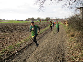 Der zweite Start folgte um 13:45 Uhr für die AK U14 und U16 über ebenfalls eine Runde von 1,2 km. Da stellte Achim noch kurz meine Seite vor, aber ich musste mich sputen, denn ich hatte nur noch 15 Minuten zum Aufwärmen und an sich zu wenig für mich. Ich lief dazu die Runde ab. Nach den vier Starts gestern beim Crosslauf in Weinstadt auf einer sehr anspruchsvollen Strecke, die durch matschige Wiesen noch schwerer wurde, war ich gespannt wie es ging. Das größere Problem war dabei, dass der Rücken noch Probleme macht. Es lief aber recht gut und ich hatte zu Beginn ein gutes Tempo drauf und die Wiese war trocken und deutlich besser zu laufen als gestern. Das Feld der Nachwuchsläufer kam natürlich immer näher und nachdem es von der Wiese nach rechts auf den Feldweg am Wald entlang ging, machte ich einen kurzen Fotostopp. Beim Übergang auf den Weg etwas schmierig, da musste man doch aufpassen. Der Weg war gut zu laufen und auch die Rechtskurve Richtung Anstieg diesmal völlig unproblematisch. Das Stück direkt vor dem Anstieg war aber mal wieder tief und matschig, aber abgestreut und so ging es. Am Anstieg der einzige Abschnitt, wo es etwas rutschiger war, mit den Spikes aber kein Problem. Dann am Schluss wieder auf dem Weg. Insgesamt nur 1,5 km und das war an sich viel zu wenig, damit ich für die kommende kurze Strecke richtig aufgewärmt war. Zumindest machte der Rücken mit und auch die Beine fühlten sich nach den Läufen gestern besser an als befürchtet.