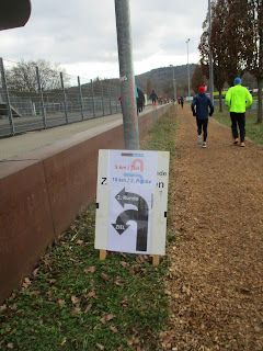 Ich machte mich nun schon mal ans Aufwärmen. Dazu lief ich wie üblich einen Teil der Strecke ab (diesmal sparte ich mir die Strecke im Wald bis auf einen Teil des Pfades) und ich fühlte mich schon recht gut, konnte den Nachtdienst um 5 Uhr eine Stunde früher beenden. Nicht so viel und kurz nach 10 Uhr mehr oder weniger wach, aber die eine Stunde machte gegenüber den letzten Wettkämpfen wohl doch was aus. Auch sonst seit einiger Zeit endlich wieder ein gutes, lockeres Laufgefühl. Es geht bei diesem Lauf seit einigen Jahren gleich an der Tribüne vorbei und dann nach links, wo man ein Stück über Wiese mit zwei kleinen Hügeln läuft. Im Gras auf jeden Fall etwas kraftraubender. Dann wieder zurück und am Stadion nach links und durch den Park Markwasen Hier alles auf einem schmalen asphaltierten Weg. Nach dem ersten Kilometer dürfte sich das Feld dann auseinander gezogen haben, so dass man nicht neben dem asphaltierten Bereich laufen muss. Es steigt hier leicht an und dann geht es runter am Wald entlang, in den man scharf nach links abbiegt. Ich lief gleich nach rechts und dort noch kurz ein gutes Stück auf dem schmalen Pfad, um zu sehen, wie der Zustand ist. Es war hier gut zu laufen, nur bei dem Abschnitt runter etwas schmierige Stellen. Auch die Brücke stellte heute kein Problem dar. Dann geht es wieder zurück in Richtung Stadion und die Strecke wie immer bestens markiert und abgesperrt. Nach gut 4 km fühlte ich mich doch recht gut.