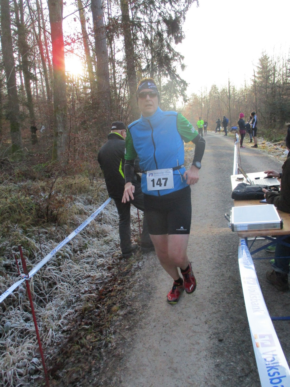Es ging nun zum ersten Mal an diesem Tag zum Start und das gemeinsam mit Andy Schick. Da mussten wir uns kurz durchfragen. Es sind von der Halle ca. 500 m. Der Start- und Zielbereich befindet sich an der Hagenbuchallee und es war die Straße von Echterdingen nach Steinenbronn zu überqueren. Im Wald dann eine erste Aufwärmrunde und bewusst ohne Handschuhe. Hier doch recht schattig und deshalb frisch und mir war klar, dass ich zum Wettkampf welche anziehe. Die Voraussetzungen waren alles andere als perfekt: zwei harte Wettkämpfe am Montag und Dienstag und dann in der Silvesternacht Nachtdienst. Durch die Entfernung deshalb auch bei dem späten Start nicht viel Schlaf und zudem keine Zeit für ein Frühstück bzw Essen. Dennoch fühlte es sich zumindest nicht so schlecht an. Insgesamt absolvierte ich gute 3 km. Es ging auch noch mal zurück zur Halle und dann alles unnötige im Auto lassen und nur die Jacke mitnehmen.