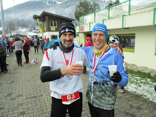 Es folgten tatsächlich sechs Tage ohne Laufen, was ich Jahre nicht mehr hatte. Am Sonntag, 01.12. fühlte ich mich zumindest fit genug, am Nikólauslauf in Immenstadt teilzunehmen und mit am Start war endlich mal wieder Jusra und auch noch deren Freundin. Es war dort schon mal schön viele Bekannte zu treffen und bei kühlen 1° C und teils glatter Strecke konnte ich trotz früher und großer Probleme (die Schlaufe am rechten Stock riss) beim Nordic Walking über 5,2 km in 34.28 min nicht nur schneller als letztes Jahr sein, sondern holte vor dem starken Gegner Thomas Knecht den Gesamtsieg. Es war der insgesamt achte seit 2012. Jusra und Laura absolvierten den Wettkampf gemeinsam und etwas kurios war, dass Jusra zwar klar als erste über die Ziellinie ging, aber dennoch zeitgleich auf Rang 2 geführt wurde.