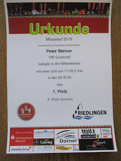 Der Misse-Lauf in Riedlingen am Sonntag, 24.11 war zugleich wieder die Kreiswaldlaufmeisterschaft und dort wurde ich 2018 auf der Mittelstrecke erstmals überhaupt Kreismeister. An eine Titelverteidigung war nicht zu denken und ich konnte nur mit angezogener Handbremse starten. Dennoch über die Mittelstrecke von 4000 m nach 17.09,2 min etwas überraschend auf dem 3. Platz der Meisterschaft und zudem Sieger der AK M50. Den anschließenden Lauf über die Langstrecke von 8000 m auf zwei Runden der schönen Strecke dann nur noch als flottes Training und in 36.42,0 min auf Rang 5 in der AK M50 (unverständlicherweise mit Zehnerschritten) bei der Meisterschaft. Es war in diesem Monat bereits der 18. Start und damit so viele wie noch nie innerhalb eines Monats.