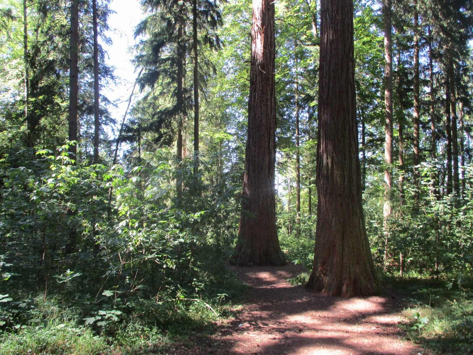 Vom Böllat zunächst auf einem flachen Abschnitt und teils auch mal Asphalt an Burgfelden entlang und von dort nach rechts steil runter über einen holprigen Weg ins Wannental und dort auf breiten Forstwegen zu den Mammutbäumen. Die stehen dort seit 1864.