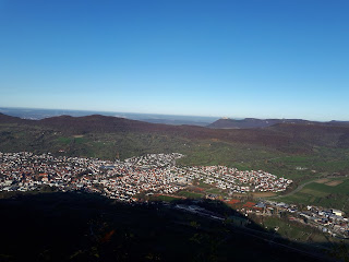 Nach einem guten Kilometer durch den Wald erreichten wir wieder den vorherigen Abzweig nach dem Fohlenhof und von dort nun auf mir bestens bekannten Wegen im und am Wald Richtung Uracher Wasserfall zum Rutschenfelsen. Bis dorthin waren es weitere gut 2 km. Von dort eine tolle Aussicht auf die Ruine Hohenurach und den Runden Berg.