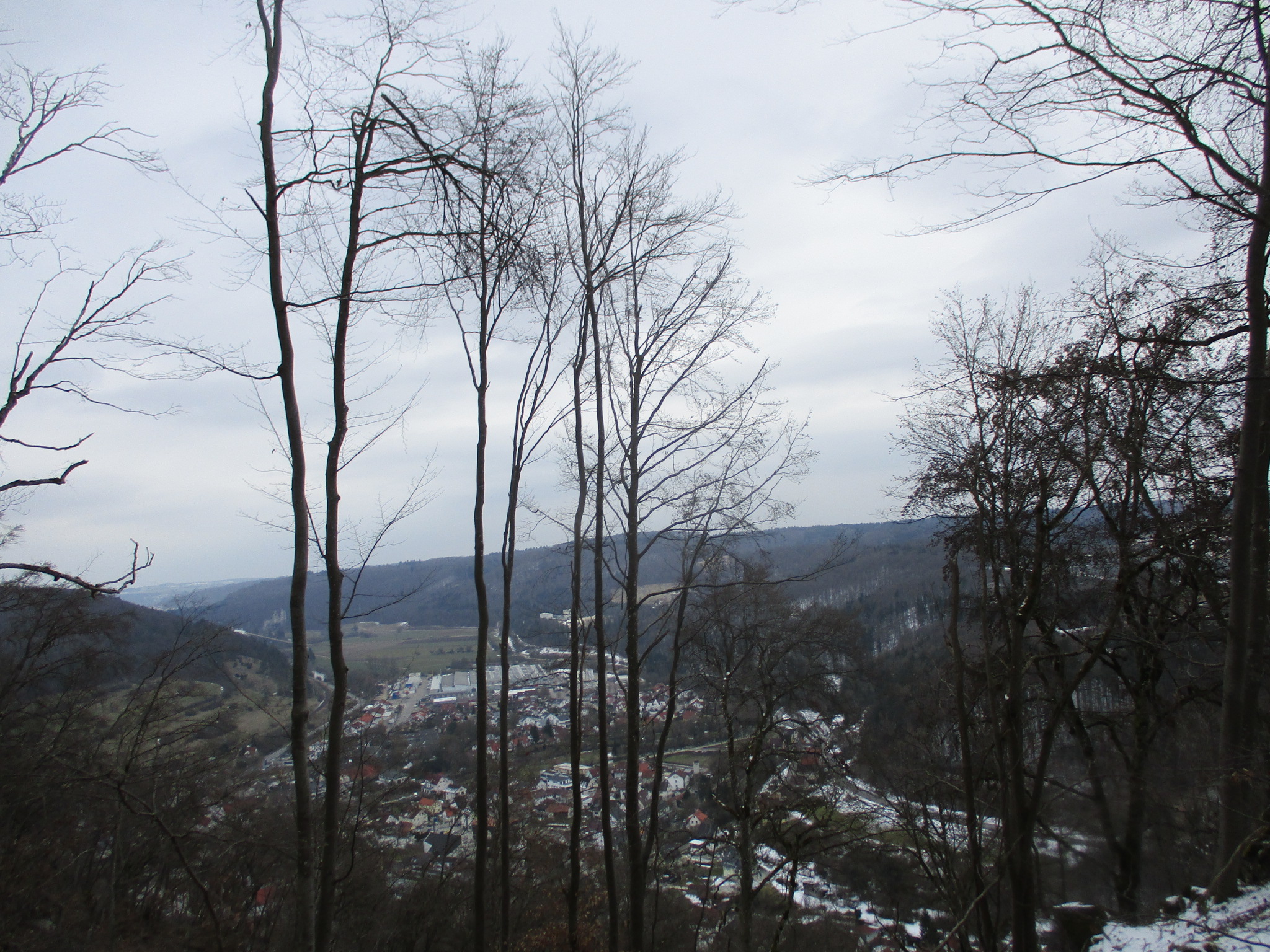 Weiter ging es auf einem Pfad, den ich am Dienstag erstmals gelaufen bin und da hat man kurz einen schönen Blick auf Teile von Gerhausen. Man kommt dann oberhalb der Gaststätte Schillerstein raus und es geht kurz auf der Straße dort hin und da links am Waldrand entlang leicht ansteigend hoch. Danach durch den Wald und erstmal tendenziell leicht runter. Es sind zwar breitere Forstwege, aber teils doch sehr matschig und ein paar Hindernisse. Am Ende dann nochmal steiler runter. Es lag nur wenig Schnee, aber teils war es recht schlammig. Es lief aber auch recht flott.