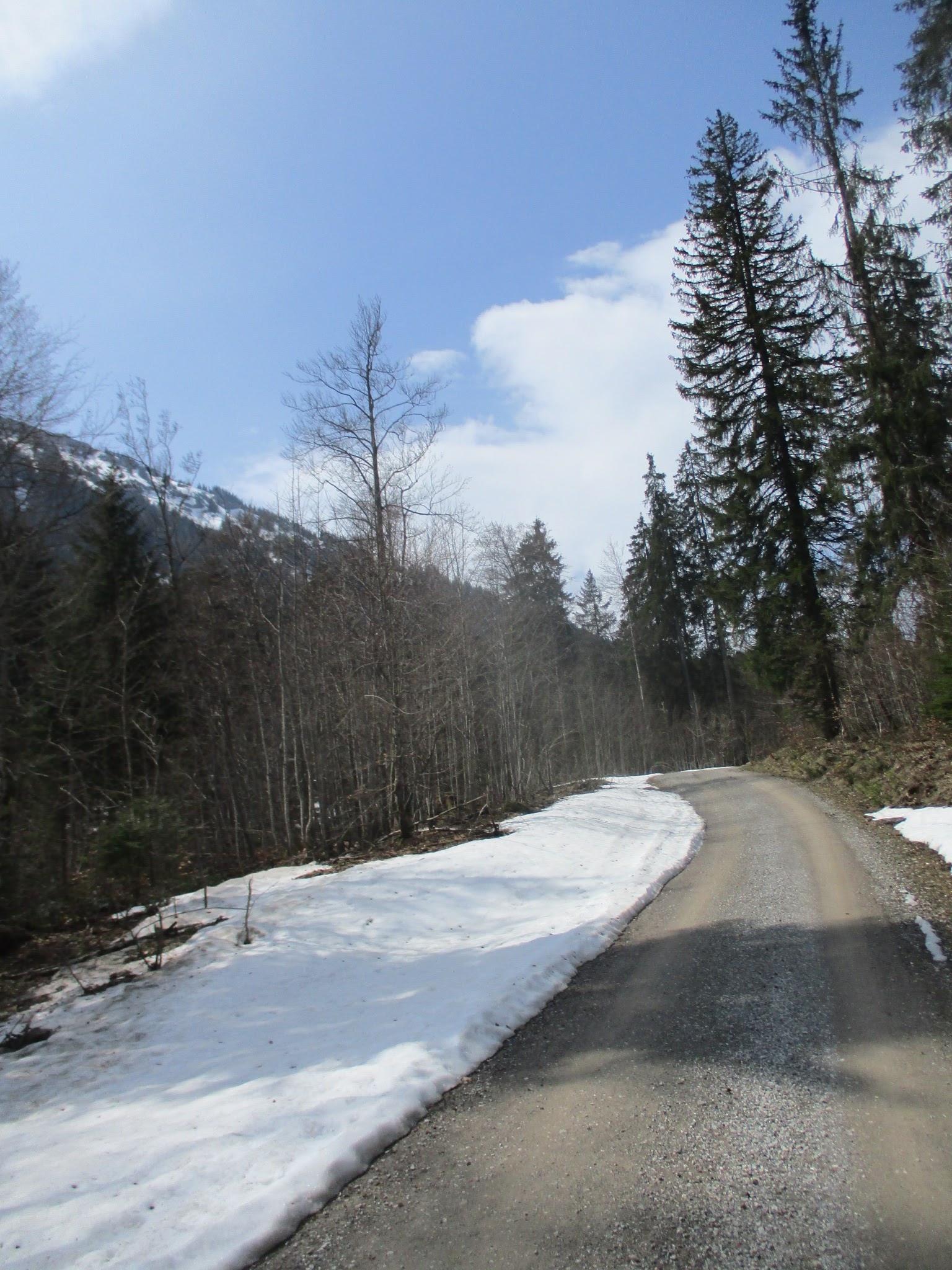 Knapp 5 km und über 400 Hm hatte ich schon hinter mir und dann kam hinter dem Gasthof nicht nur der mir bekannte sehr steile Anstieg, sondern vor allem immer mehr Schnee. Der Weg war hier vollständig bedeckt und da der Schnee angetaut war, brach ich immer mal etwas ein, was zusätzlich Kraft kostet. Immerhin war es schön sonnig. Der sechste Kilometer ist mit seinem Anstieg von 157 m auch so extrem und diesmal eine besondere Herausforderung.