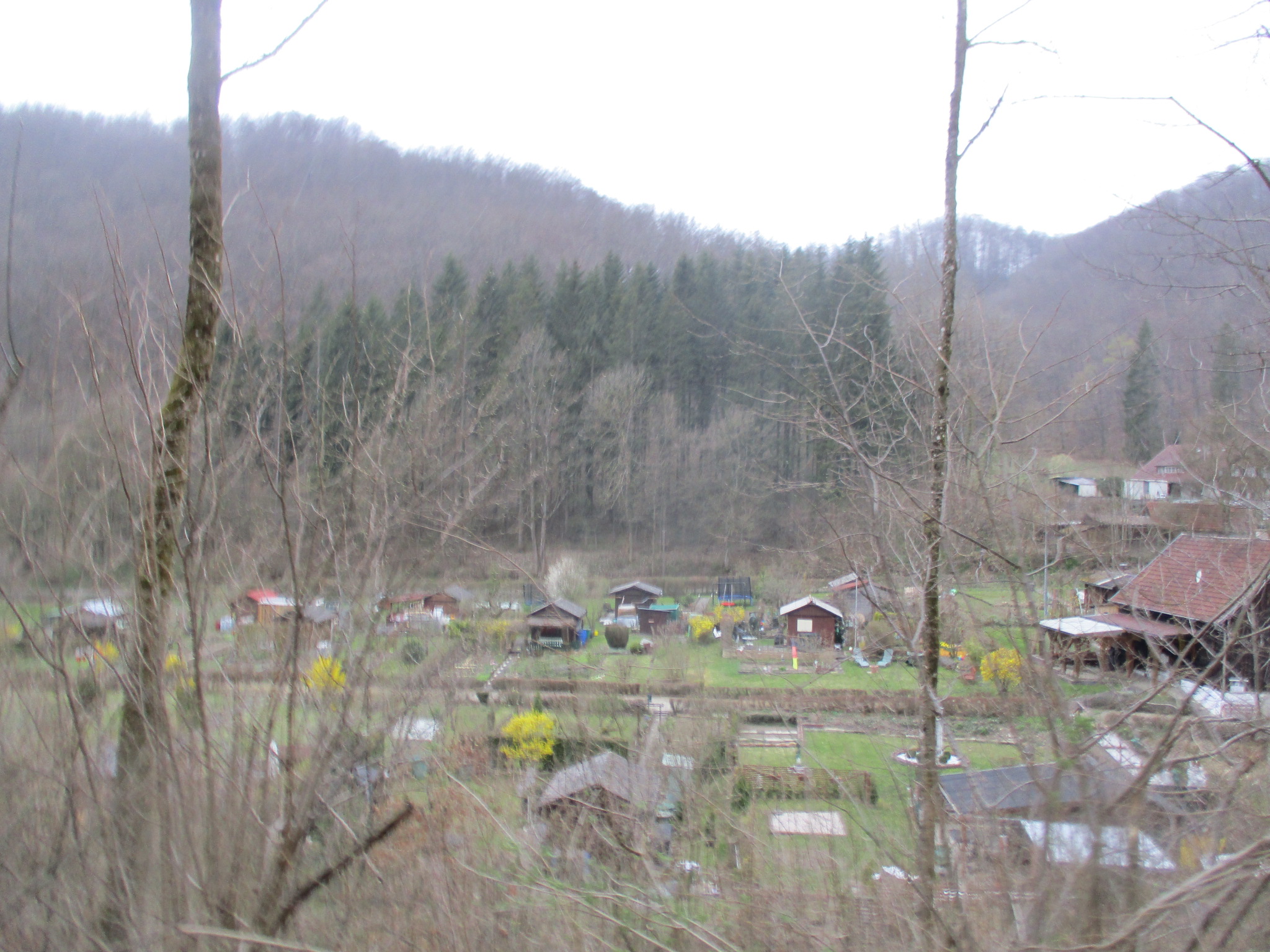Am kleinen Teich dann links weg und es ging durch das Längental mit den vielen Kleingärten. Dabei leicht ansteigend auf einem breiten Weg. Am Abzweig dann nicht nach rechts auf der ausgeschilderten Strecke, sondern links weg und dann wieder scharf links und nach einem kurzen steilen Anstieg scharf rechts. Hier ist ein perfekter Übergang zur Felsen-Tour, den ich letzten Herbst mit Matthias entdeckt hatte.