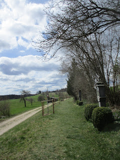 Es ging nun kurz auf der Straße hoch, dafür mit schöner Aussicht, und dann ein Pfad auf der Wiese neben der Straße. Es ging dann nach links weg und Richtung Lourdesgrotte. Das war zunächst ein schöner Wiesenweg und dann links der Abstecher über einen Pfad zur Grotte. Das war ein richtig schöner Platz und dieser Abschnitt der erste Höhepunkt.