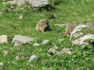 Es folgte der letzte Anstieg hoch zur Hütte. Da werde ich später wieder zurück laufen bis zum Abzweig ins Rappental. Es ging nochmal ordentlich nach oben und der 10. Kilometer noch 184 Hm. Dafür sonst recht einfach zu laufen bzw. gehen und immer wieder Stufen eingebaut. Besonders schön war endlich die Begegnung mit Murmeltieren und noch dazu eine ganze Menge. Da muss man einfach mal verharren. In der Höhe von nun rund 2000 m war es auch angenehm warm und nicht mehr schwül.