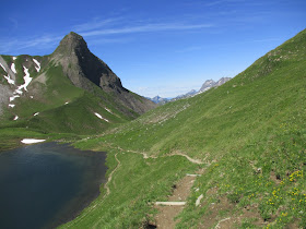 Nun war es nicht mehr weit bis zum eigentlichen Ziel des Tages, dem Großen Rappensee auf einer Höhe von 2047 m. Also erst ein Stück runter und dann der tolle Anblick. Ich umrundete den See auf toll zu laufenden Pfaden. Ein mal musste ein Schneefeld umgangen werden. Es gab unzählige Enziane und eine grandiose Aussicht. Der See dann von der zunächst angelaufenen Seite am Ende der Runde am schönsten.