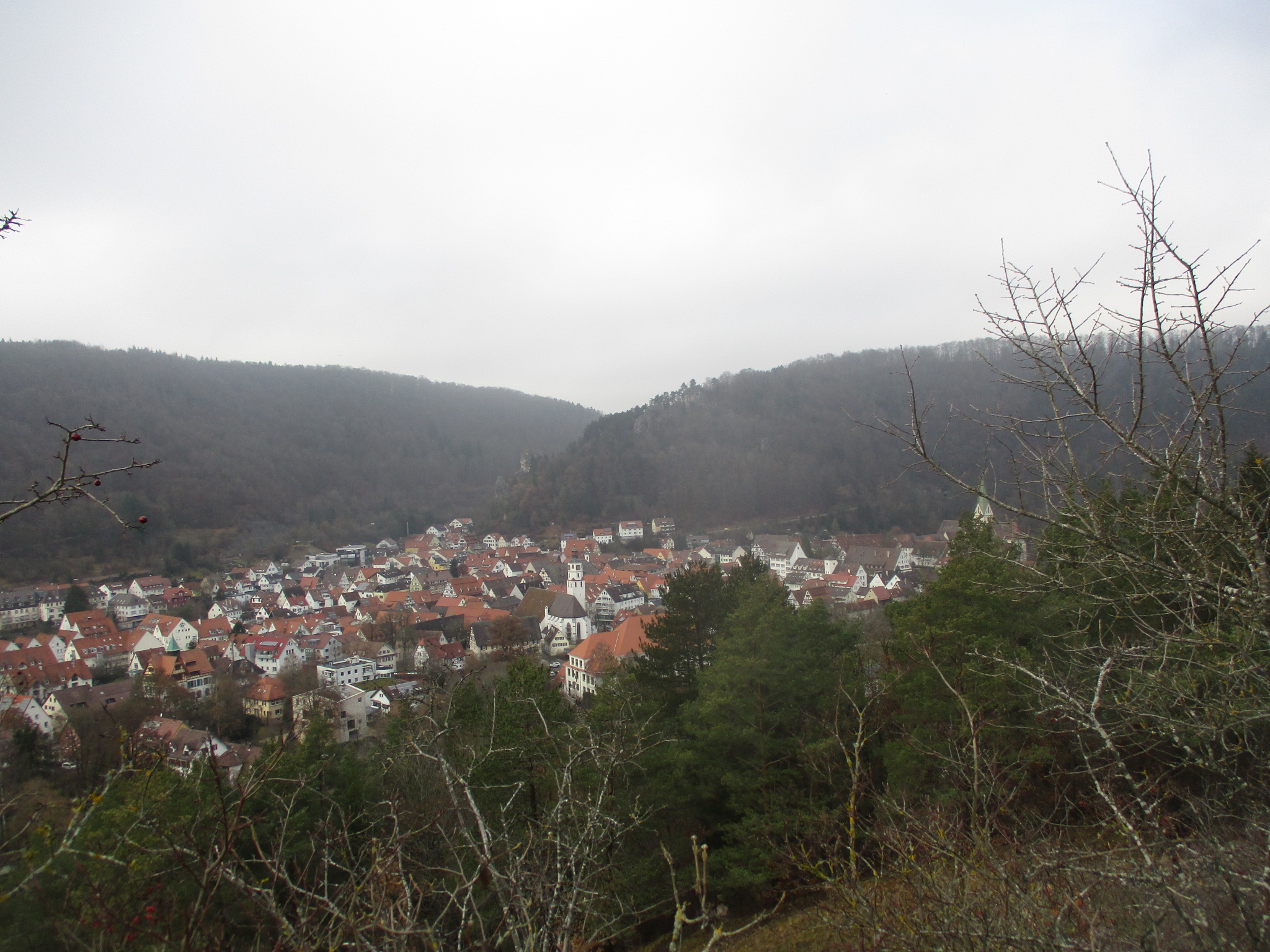 Nach diesem doch heftigen Anstieg ging es zum Blaufels. Da ging es nur noch leicht wellig weiter und nach einem Feldweg auf einem schönen Pfad und danach noch etwas steiler, aber relativ gut zu laufen, runter zum Blaufels. Dabei gab es aber doch durch die Nässe rutschige Steine und Vorsicht war angesagt. Vom Blaufels einfach der schönste Blick auf die Stadt und das Tal.