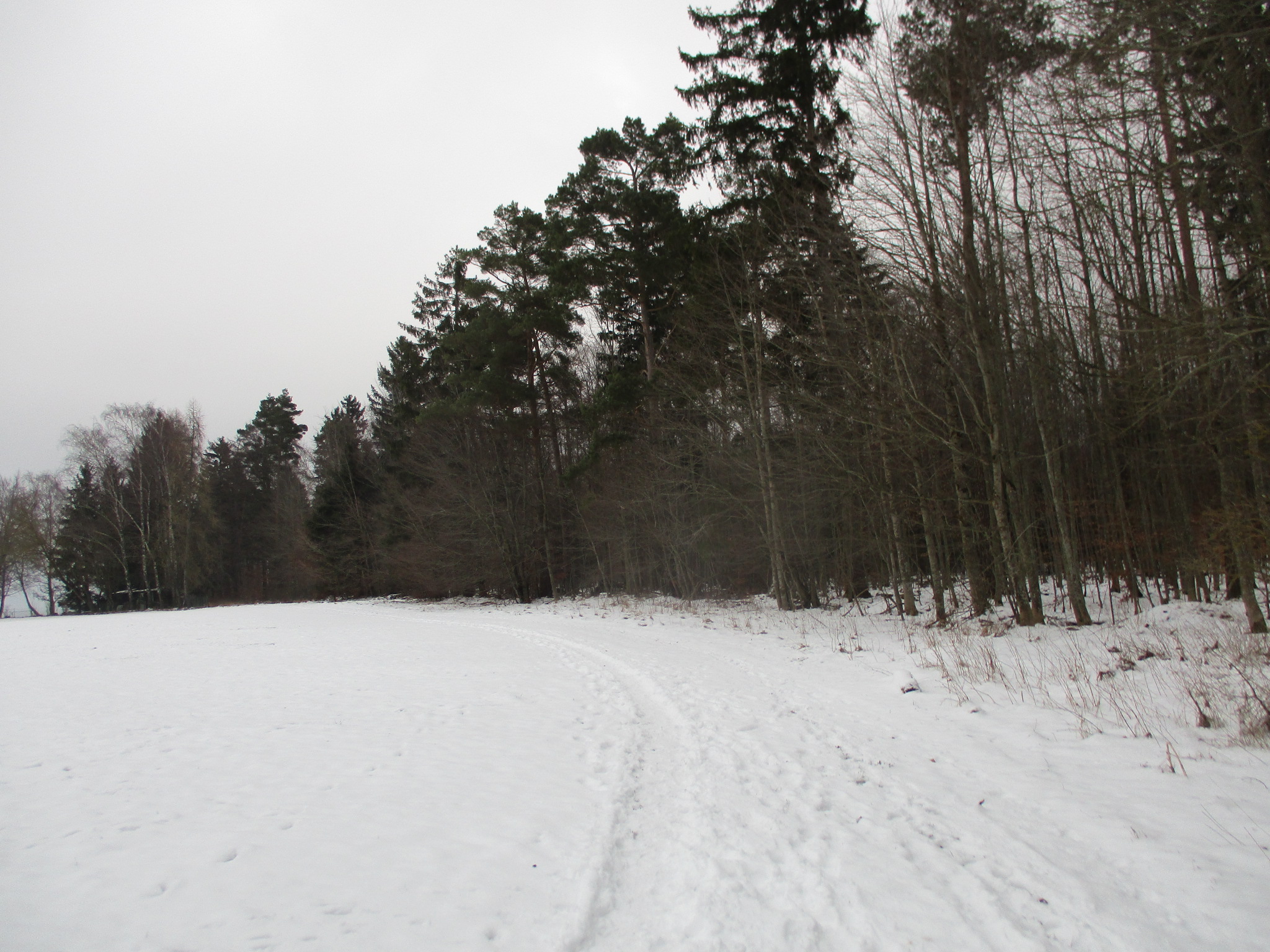 Oben angekommen empfing mich eine Winterlandschaft. Da war es dann auf dem an sich nun einfachen Weg zur Ruine Günzelburg nicht einfach zu laufen, zumal der harte Anstieg noch nachwirkte. Es war nun auch ziemlich bedeckt, aber zumindest sollte es trocken bleiben. Nach rund 19,6 km zeigte sich die Ruine.