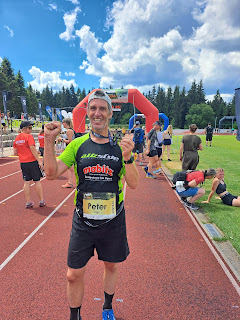 Es ging noch ein kurzes Stück durch das Tal, bevor es zunächst leicht anstieg. Da spürte ich schnell, dass ich offensichtlich Kraft eingespart hatte, durch die vielen Kilometer und Höhenmeter der letzten Wochen gerade auch im Allgäu, doch eine gute Form aufgebaut hatte. Es waren noch 3,5 km und ich sah meinen Konkurrenten in der AK vor mir. Noch war es ein gutes Stück, aber nun lief es. Ich machte einen Platz nach dem anderen gut, musste nicht gehen, so wie viele. Ich fand einen sehr guten Rhythmus und nun bergauf störten auch die Blessuren nicht. Es war jetzt zwar gut warm, zumal der Forstweg hier breit war, aber das bin ich ja gewohnt. Der neunte Kilometer hatte einen Anstieg von 101 Hm. Da war die Zeit von 8.10 min in der Phase des Rennens gut. Ich musste am ganz steilen Stück kurz gehen, fand aber eine schnellen und langen Schritt. Das war kein Vergleich zum Samstag, aber auch 25 km weniger in den Beinen. Da ging ich an meinem Kontrahenten vorbei. Es folgte wieder die Motivationsgruppe von ON. Auf den Becher Wasser verzichtete ich. Es war nur noch knapp 1,5 km ins Ziel und ich merkte, dass es passt. Es folgte der Single Trail bergauf und auch da lief es. Da machten schnell ein paar vor mir Platz, die gehen mussten. Auf dem kurzen flachen und auch leicht abfallenden Abschnitt vor dem Kletterwald sah ich, dass ich zwar einen Vorsprung hatte, aber nicht so groß wie erhofft. Ich wurde von ihm beim letzten Downhill überholt und er war demnach hinter mir gestartet und bei der Nettozeit-Wertung musste ich mehr Vorsprung raus laufen. Das motivierte und ich setzte am Kletterpark alles auf eine Karte und stürmte den zwar kurzen, aber steilen Anstieg hoch. Danach war es ja erst mal flach und der Pfad super zu laufen. Es fühlte sich nun an, als ob ich da über die Strecke fliege, die Beine so was von locker wie ich es am Ende eines Wettkampfes selten erlebte, Dann noch die Anfeuerung am letzten Anstieg vor dem Sportplatz. Da lief ich richtig gut hoch und sprintete die letzten 80 m noch auf der Bahn. Nach 1:07.62 h war ich im Ziel und eine zuvor nie erwartete Zeit und auf den 10,5 km ein Schnitt von guten 6.28 min/km (meine Uhr zeigte 10,36 km und deshalb 6.33 min/km). Es waren wie am Samstag auch noch 34 Hm mehr, nämlich 334. Die Ergebnisse gab es ja gleich und als ich nach einiger Erholungszeit schaute und meine Konkurrenten nun im Ziel waren, stellte ich fest, dass es ein super 32. Platz unter am Ende 208 Teilnehmern und Platz 29 von 100 Männern war. Hatte ich da aufgeholt! Es reichte vor allem zum Sieg in der AK M55 mit 13 bzw. 31 Sekunden Vorsprung. Das war ein taktisch hervorragendes Rennen und am Samstag hätte ich das nicht für möglich gehalten.