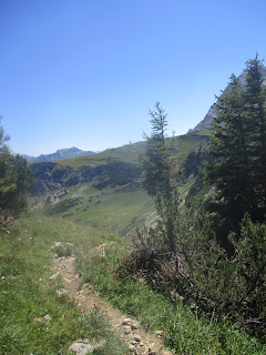 Es ging zunächst zurück bis zum Abzweig, wobei man konzentriert laufen muss. Dann links weg und in Richtung Zipfelsalpe. Ich hätte dann einen direkten Weg zum Bschießer nehmen können, aber die Alpe war die letzte Gelegenheit einer Einkehr für lange Zeit. Es ging einen Pfad mit toller Aussicht teils steil nach unten. Einfach zu laufen war es nicht und es wurde nun schon gut warm. Es kam eine kleine Senke und ein kurzer Anstieg, dann war ich am nächsten Abzweig zum Bschießer und sah bereits die Alpe. Ich lief runter und zwischen einer Rinderherde durch.