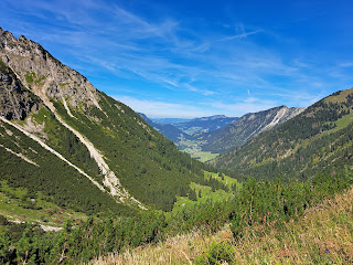 Auch in diesem Jahr darf eine Tour nicht fehlen: ein Lauf zum Schrecksee. Eigentlich wollte ich bereits am Dienstag laufen, benötigte nach dem längeren Lauf am Bodensee aber eine Pause und dieser Lauf damit aber gemütlich, da es nur noch 4 Tage bis zum Marathon waren. Ich wollte eine etwas neue Variante laufen auch wenn ich praktisch jeden Abschnitt in irgendeiner Form schon mal lief. Es ging zunächst mit der Bahn von Memmingen nach Sonthofen und zum Glück ein Sitzplatz, was ab Kempten spätestens ein Problem war. Der Zug hatte etwas Verspätung, aber zum Glück hatte der Bus der Linie 48 nach Bad Hindelang zum Busbahnhof gewartet und so konnte ich rund 15 Minuten später, in denen ich noch trank und einen Riegel zur Stärkung nahm, mit dem nächsten Bus weiter nach Hinterstein zum Bergsteigerhotel Grüner Hut. Dort kam auch gleich der Bus Richtung Giebelhaus und ich wollte erstmals bis zum E-Werk Auele, dem Beginn des Anstiegs zum Schrecksee, fahren. Da hier aber das 9 €-Ticket nicht galt und ich in guten 20 Minuten laufen kann und kaum Zeit verliere, entschloss ich mich doch zu laufen. Schwabe halt, aber so auch etwas Aufwärmen vor dem harten Anstieg. Das Wetter sollte an dem Tag perfekt mitspielen und es hatte zunächst 18° C und nur leichte Bewölkung, später dann aber doch recht warme 24 C. Es blieb aber vor allem trocken.