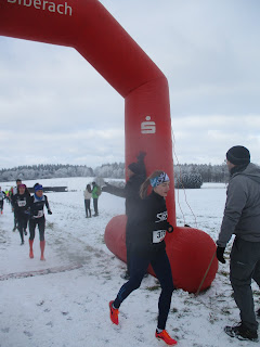 Es folgten für mich letzte Vorbereitungen und ich zog die Btooks-Schuhe an. Bei -1° C und leichter Bewölkung lief ich mit einer dreiviertellangen Hose, einem leichten Halstuch und mit Mütze. Ich lief mit dem dünnen Langarm-Funktionsshirt und dem Trikot darüber. Der Start zu meinem vierten Wettkampf in diesem Jahr und dem zweiten realen folgte um 14:00 Uhr und da ging es über zwei große Runden und insgesamt 3,4 km. Es erfolgte mit dem Jederamncross auch der Start der Jugend U18 und U20. Ich war knapp dran und so konnte ich mir das Starterfeld gar nicht richtig anschauen. Es ging pünktlich los und ich kam nicht so richtig ins Rennen ein. Als es rechst weg und auf der Wiese runter ging, war ich ziemlich am Ende des Feldes. Nur einige Jugendläuferinnen und eine Teilnehmerin des Jedermanncross oder besser der Mittelstrecke waren hinter mir. Nach der 180°-Linkskurve ging es leicht hoch und irgendwie fühlte es sich zäh an. Erst als es wieder auf der anderen Seite unten angekommen links auf dem Feldweg weiterging fühlte es sich mal besser an. Ich konnte endlich mehr Tempo aufnehmen. Dann aber ging es über die Wiese mit dem doch hohen Gras und Schnee. Das war hart. Nach einem kurzen Übergang auf der andern Seite auf der Wiese zurück und dann am Waldrand wieder auf einem Feldweg. Ich benötigte für den ersten Kilometer 4.42 min und das war sicher mehr als von mir erwartet. In der Woche wenige Kilometer, aber da lief es richtig gut. Immerhin konnte ich mich an eine kleine Gruppe vor mir heran kämpfen. Dann auf dem Feldweg zurück und rechts weg zum letzten Anstieg. Da kam ich nicht nur heran, sondern lief an einem Mädchen und einem der Jugendläufe vorbei und war gleichauf mit Silva Ritter, mit der ich mich schon in Blitzenreute duellierte. Sie hielt dagegen und ging knapp vor mir in die zweite Runde. Die erste hatte ich in 8.14 min absolviert. Da wollte ich doch deutlich, nämlich rund 20 Sekunden, schneller sein. Als es wieder runter ging, lief ich vorbei und beim folgenden leichten Anstieg konnte ich etwas Vorsprung gewinnen. Vor mir war, mit ca. 50 m Vorsprung, Tim Göhlert, also einer von meinem Wettbewerb. Ob da noch was geht? Ich kam ihm ja am Ende der ersten Runde schon näher. Der Abstand blieb aber konstant. Vielleicht ja noch am letzten Anstieg. Nach hinten konnte ich den Vorsprung nun doch etwas absichern. Es fühlte sich nun doch besser an, als zu Beginn. Als es nach der schweren Wiesenpassage wieder auf den Feldweg ging, hatte ich den dritten Kilometer in 4.55 min absolviert, nach 4.56 min zuvor für den zweiten. Wenigstens lief ich nun konstant, wenn auch konstant unter meinen Erwartungen. Diesmal war nicht an ein Duell mit der erneuten Jugendsiegerin Julia Gütler zu denken, die weit voraus war. Sonst lief ich auf der zweiten Hälfte immer davon. Mein Vordermann zeigte keine Schwäche und so ließ ich es am Ende des Anstiegs etwas austrudeln und kam nach 16.41 min ins Ziel und hatte für die zweite Runde 8.28 min benötigt und lag noch knapp vor Silva Ritter. Es war am Ende lediglich der fünfte Gesamtplatz und es wäre bei einem von mir normalen Verlauf höchstens Rang 4 drin gewesen, da die drei vorne viel zu schnell waren und der Sieger von Vogt sich diesmal mit Rang 3 begnügen musste. Der Sieg in der AK M55 stand ja beim Zieleinlauf schon automatisch fest. Ich ließ zumindest 7 der 15 Jugendläufer hinter mir, davon aber auch sechs junge Damen.