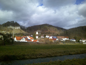 Es ging nun über die Felder nach Hausen und durch den Ort. Da hatte ich schon mal gut Gegenwind. Nach dem Ort runter zum Wald und zunächst am Waldrand und dann durch den Wald und einen Pfad runter. Es folgte dann nach der Senke gleich ein steiler Anstieg und da lief es erstaunlich gut. Nach dem Gut Muschenwang dann ein gutes Stück über Forstwege und nur leicht wellig. Dort aber teils auch sehr matschig durch die derzeitigen Forstarbeiten. Am Ende des Waldes links weg und kurz runter, bevor es auf einem kurzen Trail steil hoch geht. Dann am Waldrand in Richtung Justingen. Vor allem am Ende ohne den schützenden Wald wieder gut Wind von vorne oder von der Seite. Es ging durch Justingen durch, mit der Stauferstele bei der Kirche.