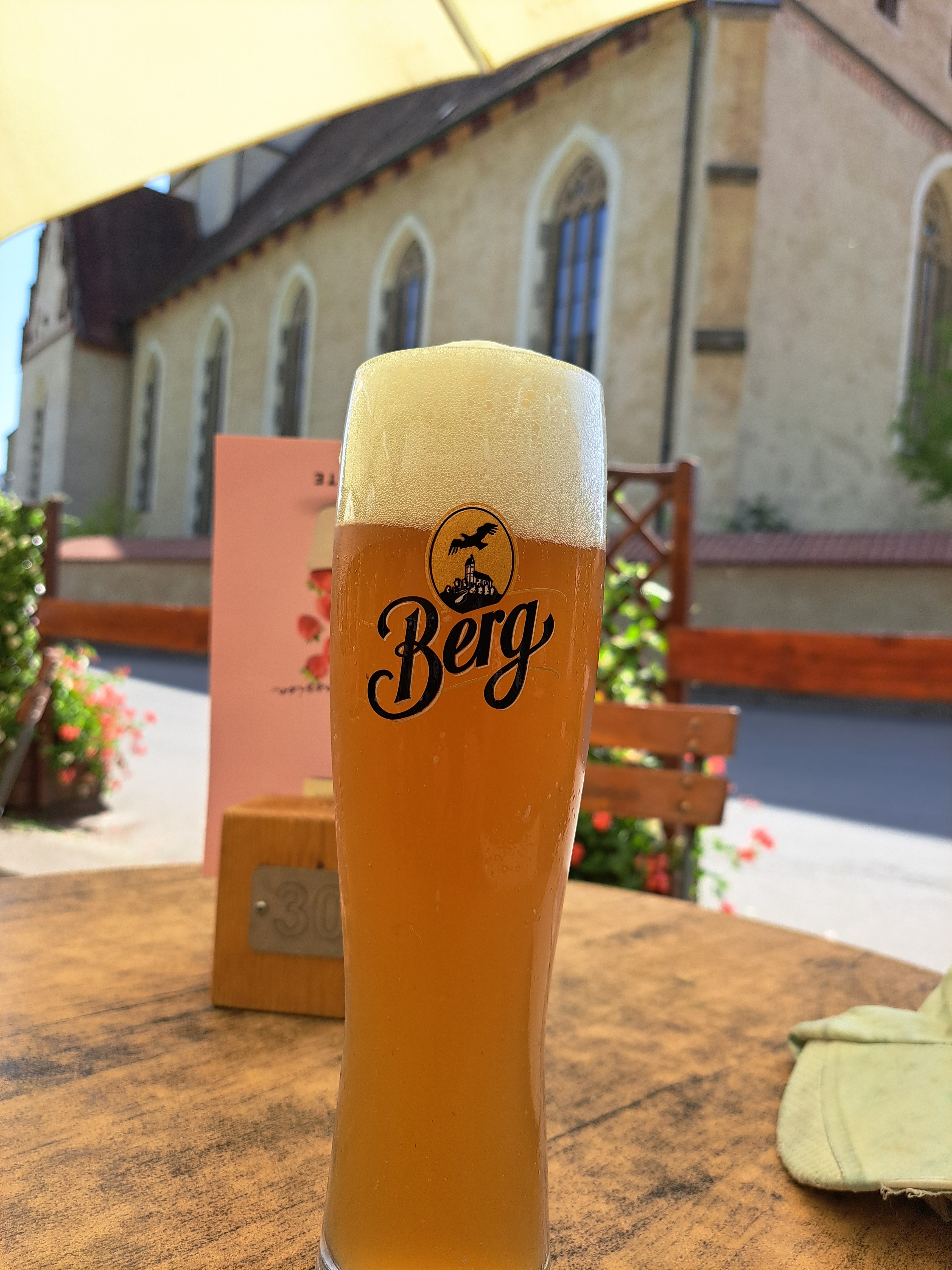 Ich wollte diesmal den Blaubeurer Felsenstieg erst rechts und dann links rum laufen. So ging es vom Bahnhof zur Blau und danach der steile Anstieg hoch zum Rusenschloss. Auch wenn ich diesmal zwei Mal vorbeikommen sollte, ließ ich den Anstieg zur Ruine mit dem schönen Ausblick aus. Danach ging es im Wald weiter nach Sonderbuch. Dort dann leider kaum noch Schatten auf dem Weg in Richtung Blaufels. Diesen ließ ich auf der ersten Runde links liegen. Auf dem teils steilen Downhill lief es dann deutlich besser als zuvor. Es wurde immerhin sogar die drittbeste Zeit auf dem Segment. Die Hitze machte aber ganz schön zu schaffen. So lief ich dann nicht nur zum Blautopf, der diesmal ein wunderschönes Türkis aufwies, sondern kehrte dort erstmal ein und das nach gut 5 1/2 km. Das kühle alkoholfreie Weizen tat gut.