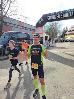 Der Start zum Lauf über 5 km erfolgte um 14:30 Uhr. Es war in diesem Jahr mein 13. Wettkampf. Es hatte 13° C und nur vereinzelte Wolken und somit gab es nur die Option ganz in kurz zu laufen. Nur der Wind könnte auf dem Rückweg etwas störend werden. Bei den Schuhen nahm ich wie zuletzt beim Marathon meine neuen Puma. Es kam ein sehr großes Feld von 184 Teilnehmern zustande. Ich stellte mich recht weit vorne auf, um dann von Beginn an recht frei laufen zu können. Anfangs geht es aber fast 1 km auf breiten Straßen aus der Stadt. Da verteilte sich das Feld recht schnell. Ich hatte kein so richtiges Zeitziel, wollte aber zumindest flott beginnen. Es passte dann auch überraschend gut und als es an der Engstelle neben der Rems leicht hoch ging hatte ich den ersten Kilometer nach 4.29 min geschafft. Ein paar Sekunden schneller hatte ich nach dem guten Start erhofft, aber es passte dennoch. Nun ging es so langsam aus Gmünd raus. An der Brücke an der die anderen Wettbewerbe rüber führen, ging es geradeaus weiter und es war die selbe Strecke wie beim Alb Marathon. Nun auf einem schmalen, aber asphaltierten Weg. Den zweiten Kilometer hatte ich in 4.44 min geschafft. Immerhin wurde ich jetzt nicht mehr überholt. Es kamen die ersten vom Wendepunkt entgegen und ich kannte auch hier etliche und es gab da auch mal gegenseitige Anfeuerung. Es ging links weg und nochmals leicht hoch, bevor die Wendestelle folgte. Auf dem Rückweg konnte man sehen, wer hinter einem lag und in meiner AK sah es super aus und einer war so ca. 100 m zurück wobei durch die Nettozeit mein Vorsprung zu diesem Zeitpunkt wohl etwas kleiner war. Da wollte ich natürlich den Platz halten und ich versuchte an die Dame vor mir heran zu laufen. Dies gelang auch nach und nach, auch wenn es nun schon recht zäh wurde. Die Beine waren sicher nicht mehr locker. Den dritten Kilometer dann in 4.49 min und das passet durchaus noch. Kurz danach überholte ich die Dame und gewann schnell an Vorsprung. So langsam arbeitete ich mich an ein Trio vor mir etwas heran. Den vierten Kilometer in 4.56 min. Ich wollte an sich unter 24 Minuten laufen, nachdem es gut begonnen hatte. Das würde nun hart werden, denn auf dem Rückweg stieg es tendenziell leicht an und der Wind nun auch mehr von vorne. Es ging nun etwas links vom vorherigen Weg zurück. An den Sportplätzen waren es noch rund 500 m und ich war an der Gruppe vor mir doch nah dran. Nach hinten noch ein guter Vorsprung vor der Dame. Am Ende der Sportplätze rechts weg und dann noch ein leichter Anstieg der weh tat. An die vorne würde ich nicht mehr ran kommen, aber ich würde es schaffen, nach der Wendestelle nicht mehr überholt zu werden. Es folgten die letzten 100 m und da gab es ein Spalier von Zuschauern, die einen ins Ziel trugen und so schaffte ich die knapp über 5 km noch in 23.56 min und den fünften Kilometer in 4.54 min und somit nicht nochmal langsamer geworden, sondern leicht gesteigert. Die Ergebnisse gab es gleich online und ich wurde 52. Gesamt und 41. bei den Männern. In der AK M55 reichte es diesmal zum Sieg und das war eine Genugtuung nach dem undankbaren vierten Platz beim Alb Marathon im Oktober.