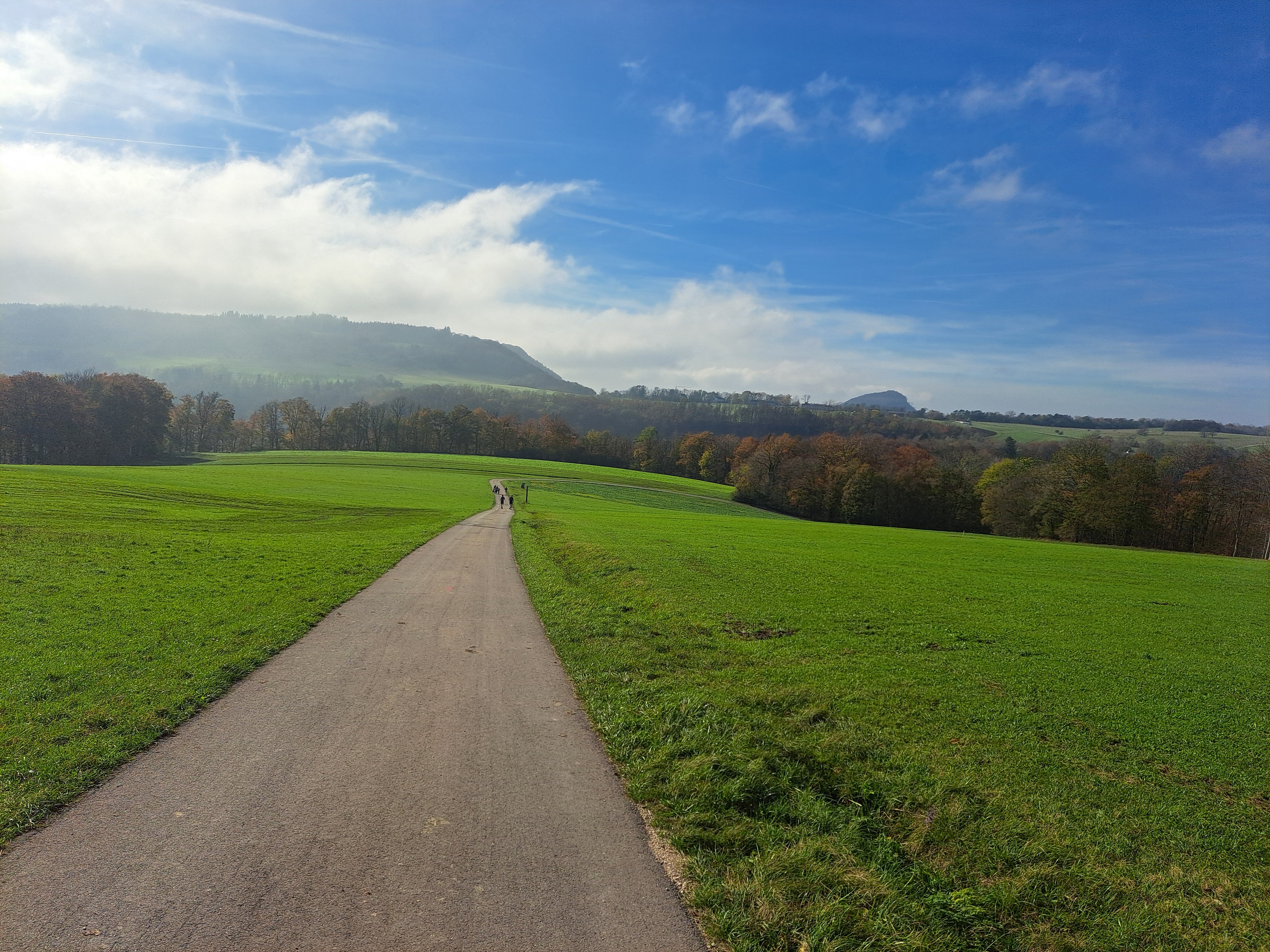 Nach der 1. VP ging es schnell wieder in den Wald und dort zunächst über einen schönen Pfad. Nach einem kurzen Stück auf breiterem Weg ging es einen steilen Downhill runter, der nicht ohne war, da es teils doch etwas rutschig war. Es ging aber alles gut. Es ging auch schnell wieder nach oben. Es ging auf Forstwegen am Bargauer Horn vorbei. Ich fühlte mich weiterhin richtig gut. Nach der Hälfte der Strecke zeigte die Uhr 2:29.55 h. Ich wollte möglichst unter 5 Stunden bleiben und das passte noch perfekt. Die Strecke war am Ende aber etwas länger und so hatte ich nach 2:32.00 h die erste Hälfte hinter mir, doch davon ahnte ich hier noch nichts. Auf dem 19. und dem ersten Teil des 20. Kilometers konnte ich es mehr begab etwas laufen lassen. Danach folgte links weg der nächste sehr lange Anstieg. Dieser erfolgte auf einem Forstweg und war so noch relativ gut zu laufen, zog sich jedoch. Immerhin konnte ich nach vorne sogar an eine Gruppe näher ran kommen. Der 22. Kilometer hatte dann gleich nochmals 112 m Anstieg. Als ich oben war, hatte ich die Gruppe eingeholt und ich erkannte Leander Schade. So liefen wir ein Stück gemeinsam. Auf dem folgenden Pfad fiel ich wieder etwas zurück. Es ging auf diesem dann zu einer Kapelle auf einer kleinen Wiesenfläche und von dort wieder steil runter. Aus dem Wald raus ging es die Straße runter. und ich ließ es wieder laufen. Dort überholte ich auch Leander, der kurz angehalten hatte. Ein kurzes Stück über eine Wiese und dann ging es auf Asphalt mit herrlicher Aussicht weiter zum 2. Verpflegungspunkt, der gleich zu Beginn des 26. Kilometers kam. Dort ein Becher Wasser und ein Becher Iso und es ging weiter.